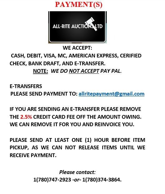 It is the purchaser's sole responsibility to make any necessary inquiries and to inspect the item before placing a bid. Viewing is available by appointment, please contact All-Rite Auctions at 1-780-747-2923 or 1-780-881-4184.