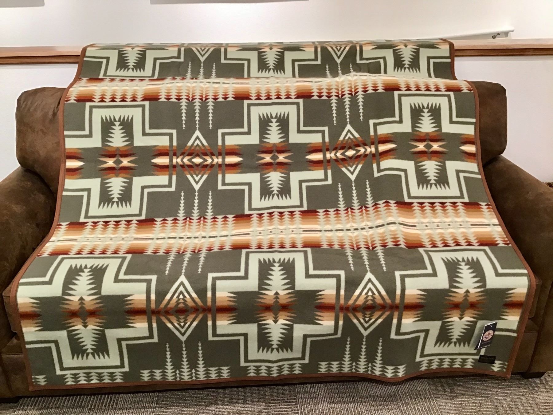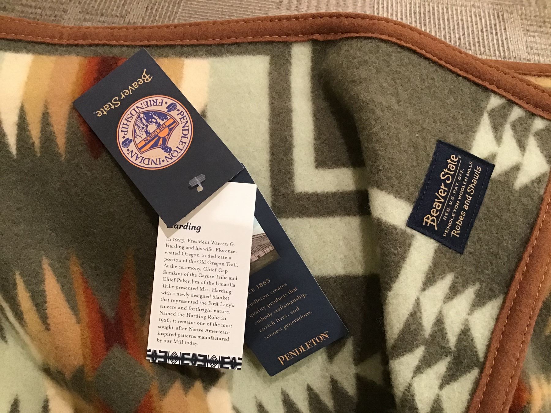 New in the box, one of the most popular Pendleton designs ever, crafted of USA-made wool in our Pendleton, Oregon mill. In 1923, President Warren Harding and his wife Florence came west to dedicate a portion of the old Oregon Trail. At the ceremony, local chiefs presented the first lady with a Pendleton shawl inspired by our famous Chief Joseph blanket. This dynamic design was an instant hit and remains in production today. "Absolutely gorgeous," says one purchaser.