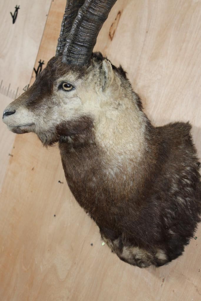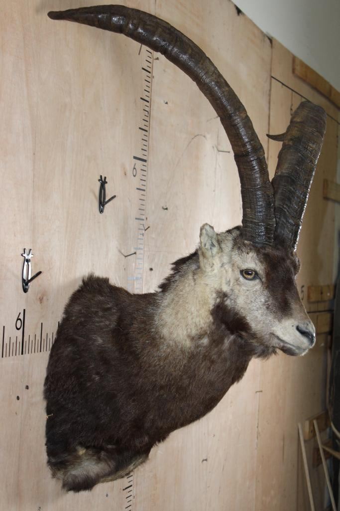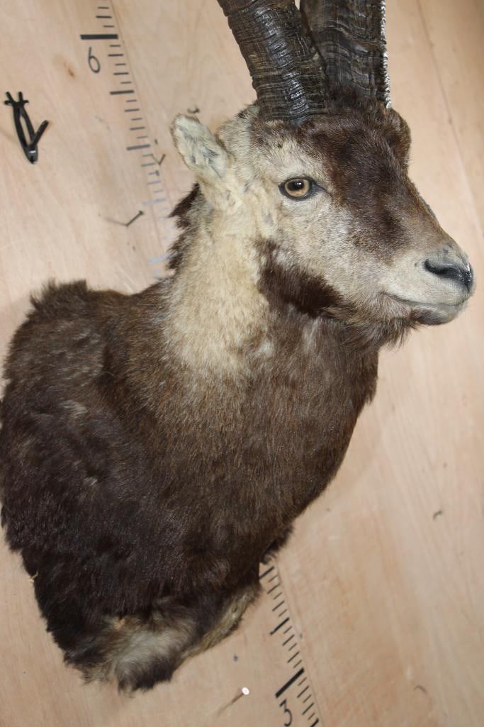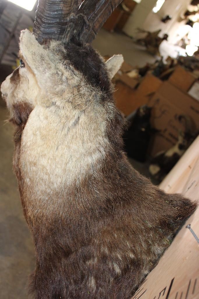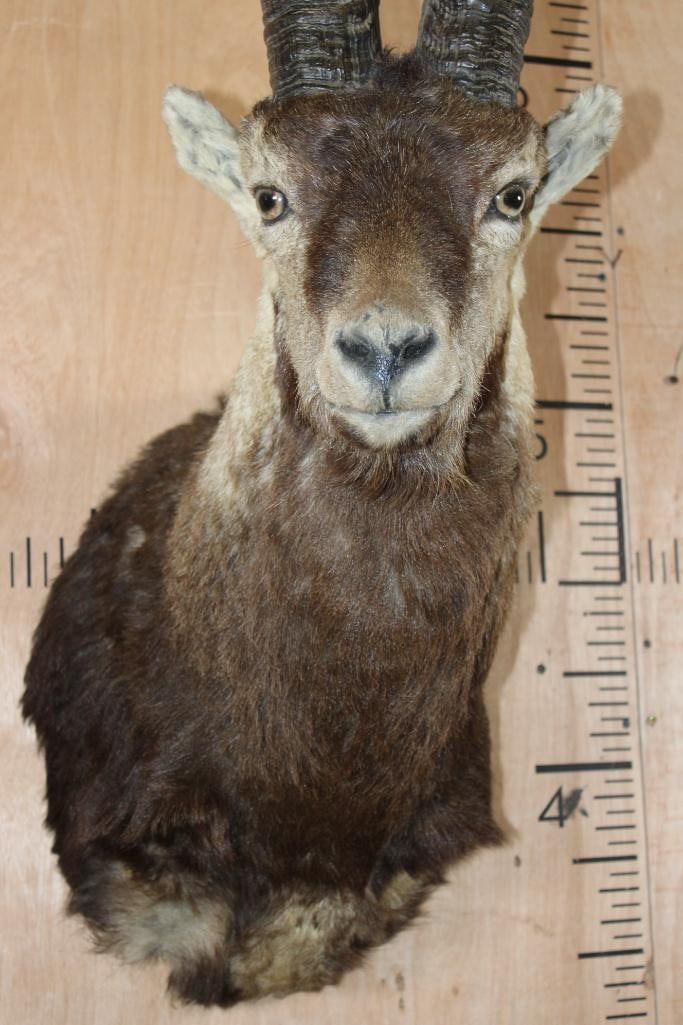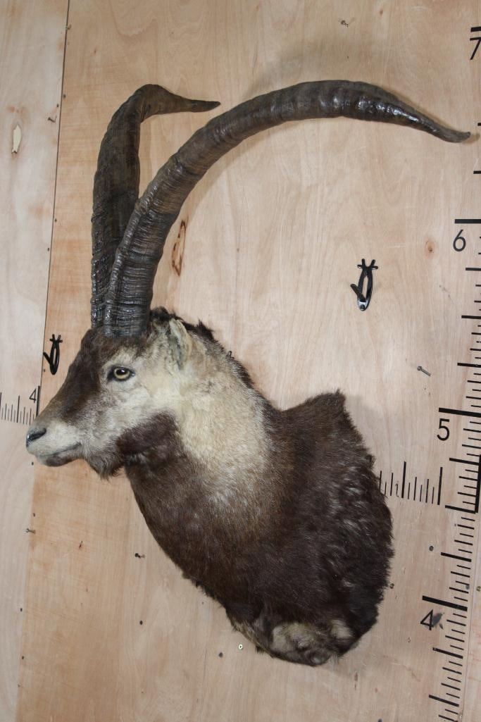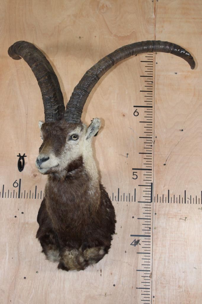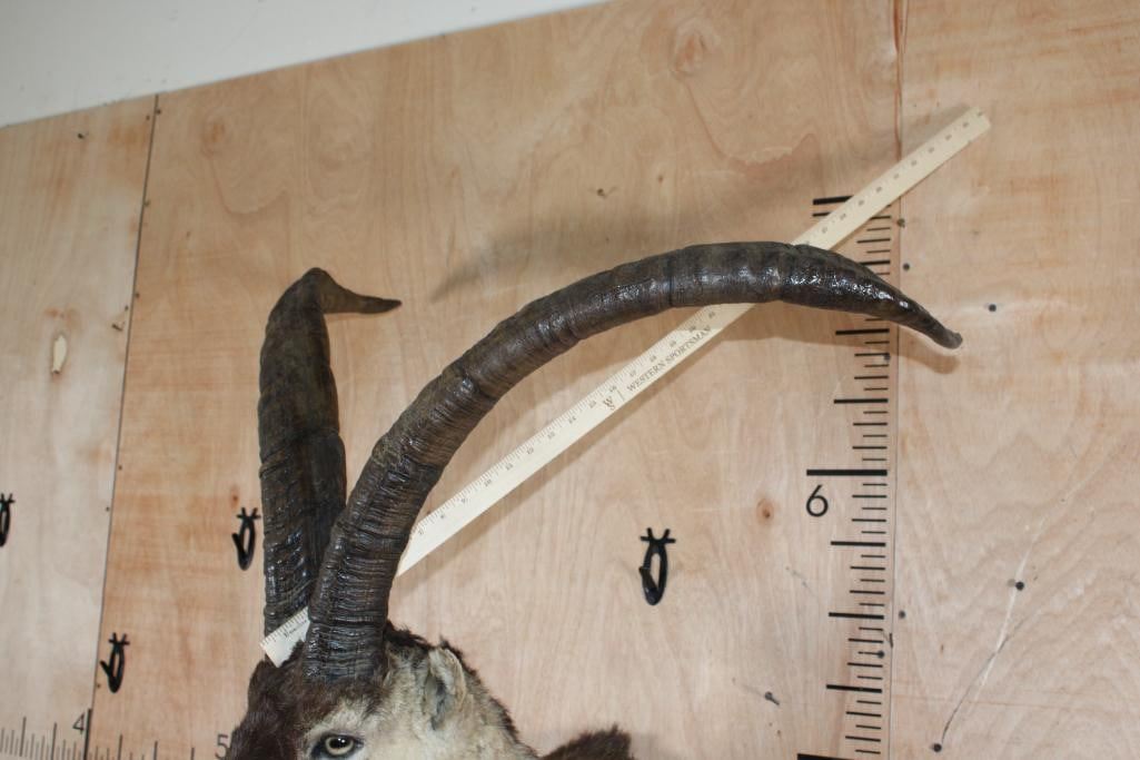 Nice PERSIAN or BEZOAR IBEX Shoulder Mount. The Left Horn measures 33" Long and 9 3/8" around the Horn Base and the Right Horn measures 30.75" Long and 9 5/8" around the Base. It is in Good Condition. TAXIDERMY