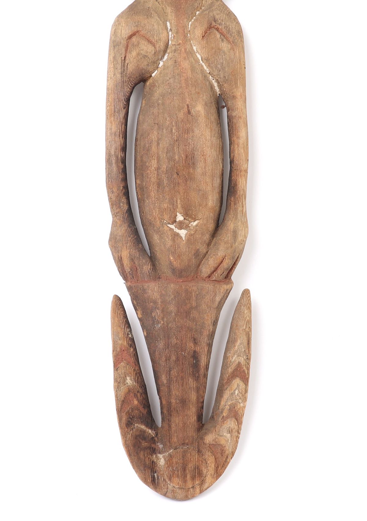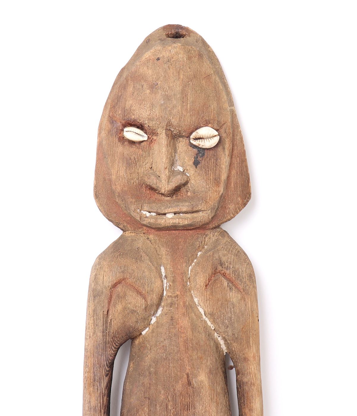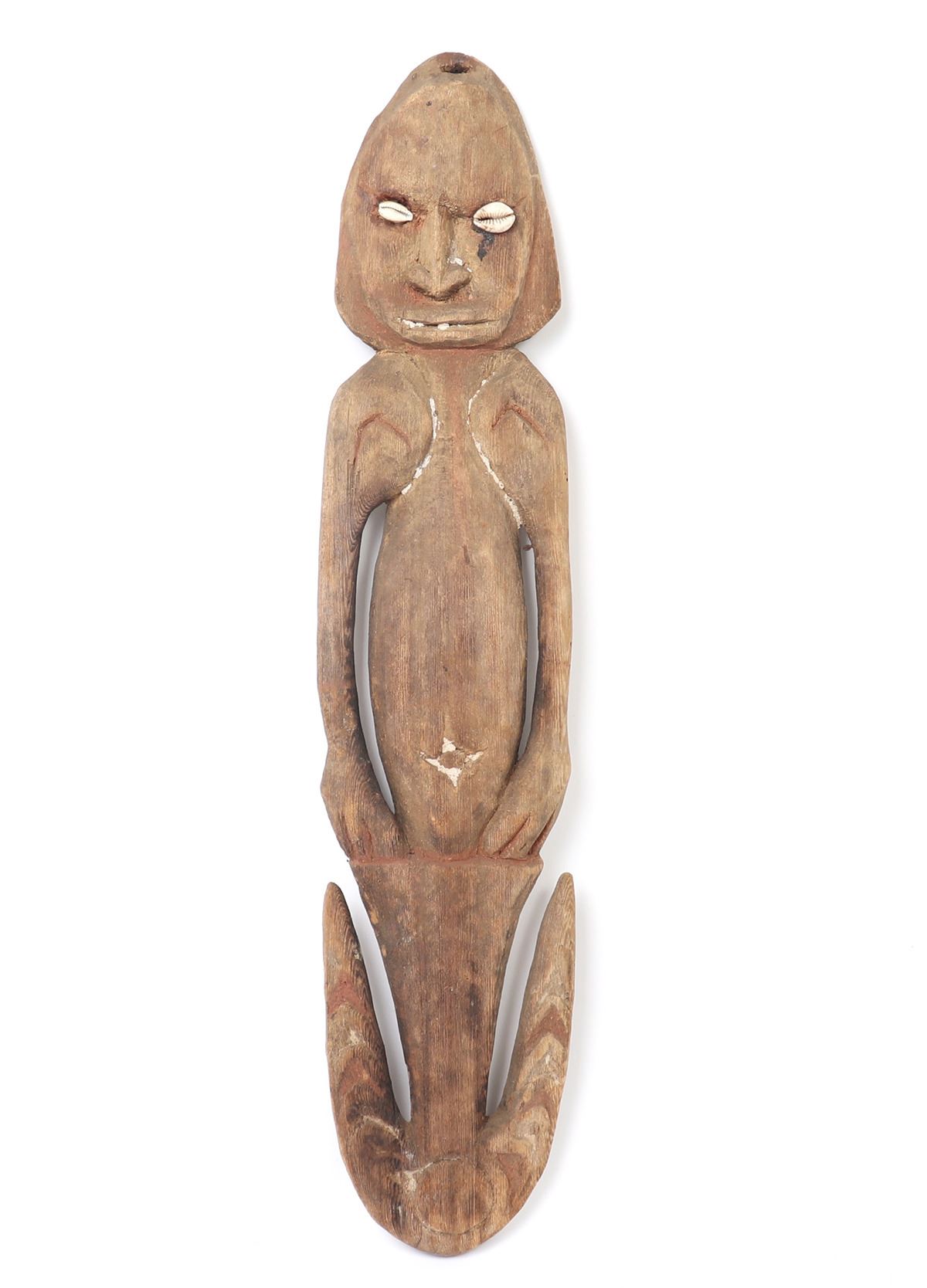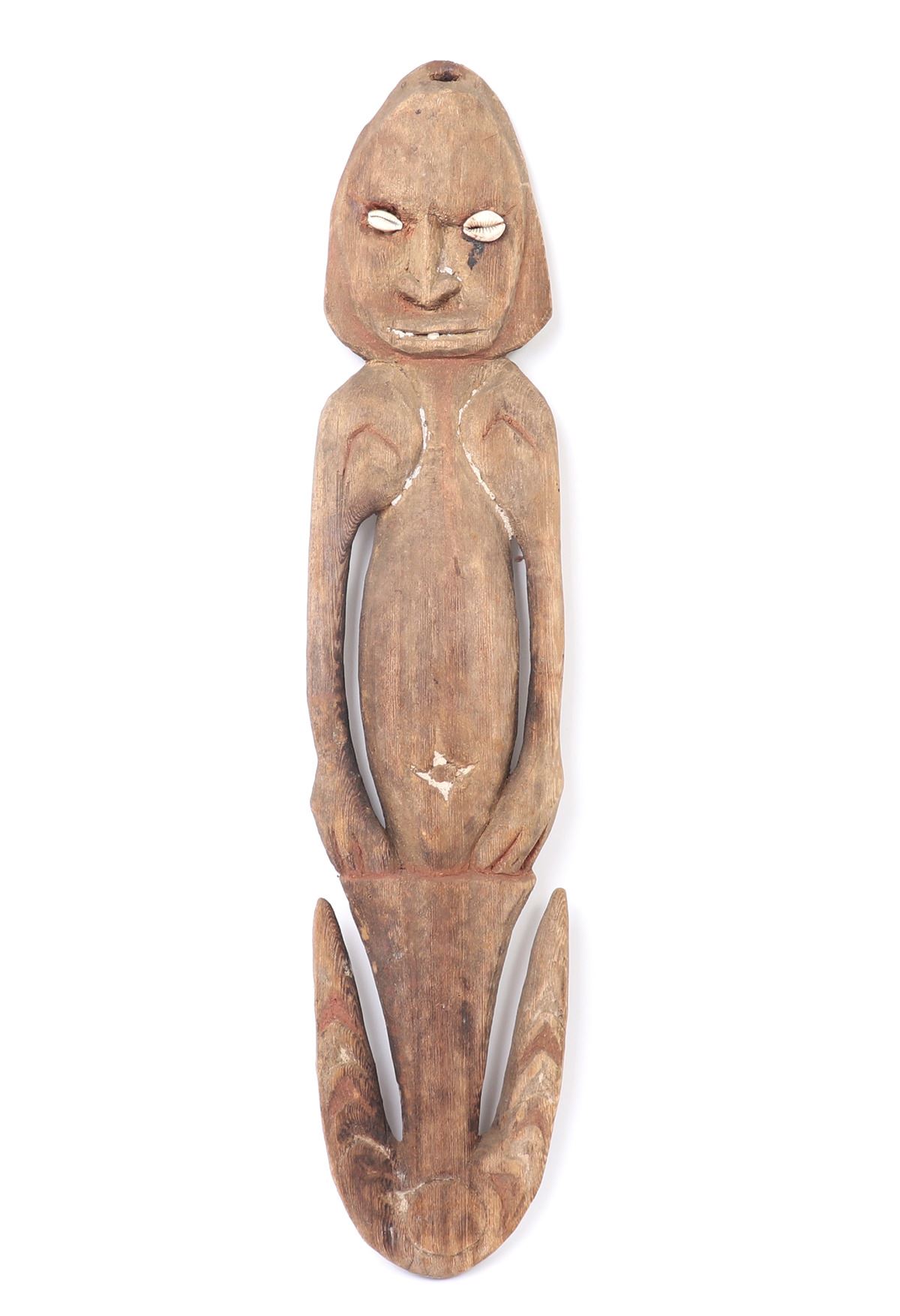 Oceania, Papua New Guinea, shell eyed anthropomorphic suspension hook with remnants of painting and inlaid coloring.
