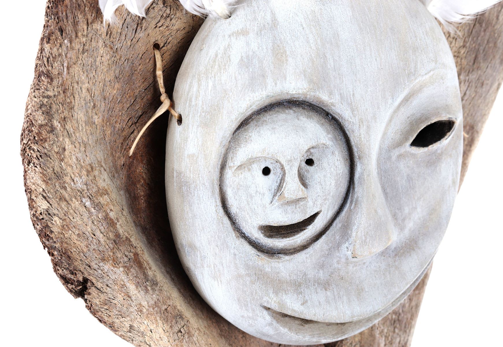 Native American, Pacific Northwest Coast, Alaska. Representing the benevolent man in the moon, beautiful Inuit bone carved mask mounted on a section of whale pelvic bone on a beautiful wood stand. Feathers affixed to the top, the faces smile boldly. Larger moon has almond slit eyes with a wide slit smile, and the man in the moon has pierced eyes with a wide brimmed smile. Size 6" W x 16" H. Condition: Good overall condition with no obvious signs of restoration or repairs.