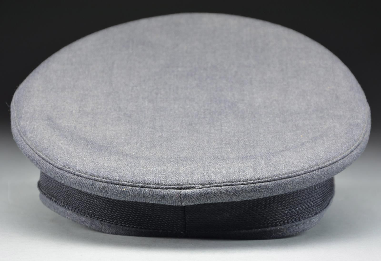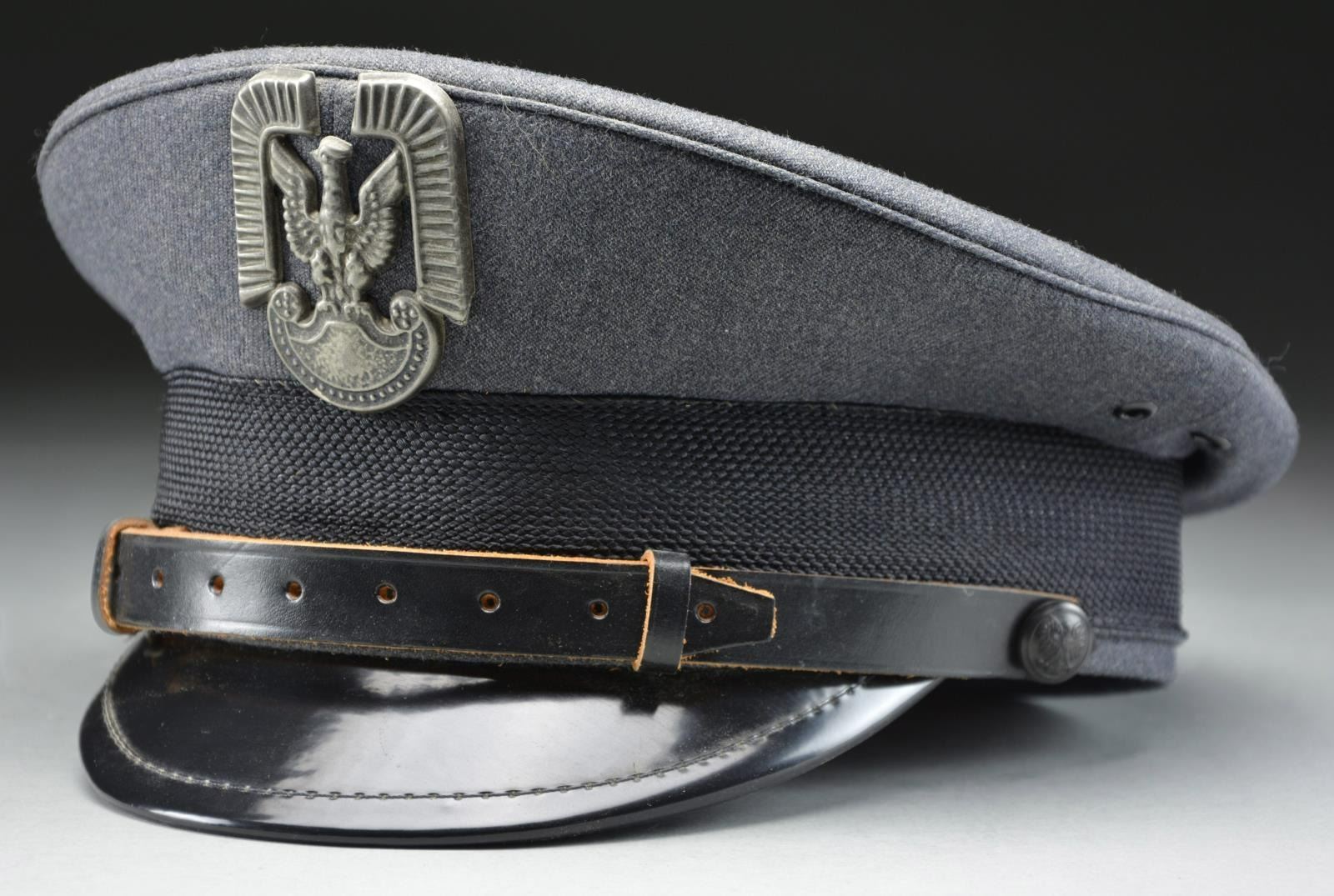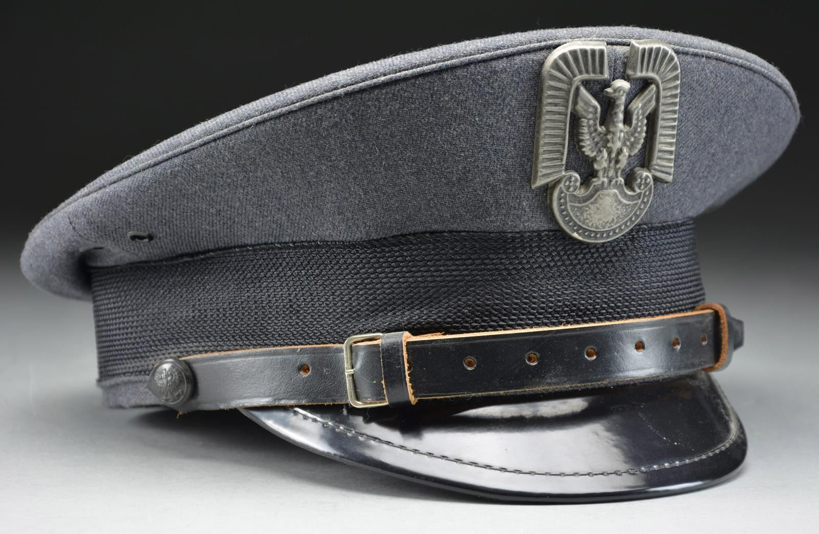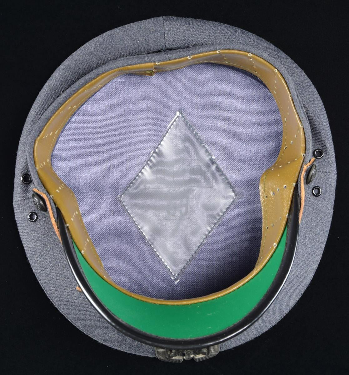 A recent issue Polish visor cap with a gray crown & a black band featuring a Polish eagle in the center of the crown. Black leather chinstrap & faux leather visor. Brown interior sweatband & steel blue lining. CONDITION: light wear overall. (02-19637/BF). $25-50.