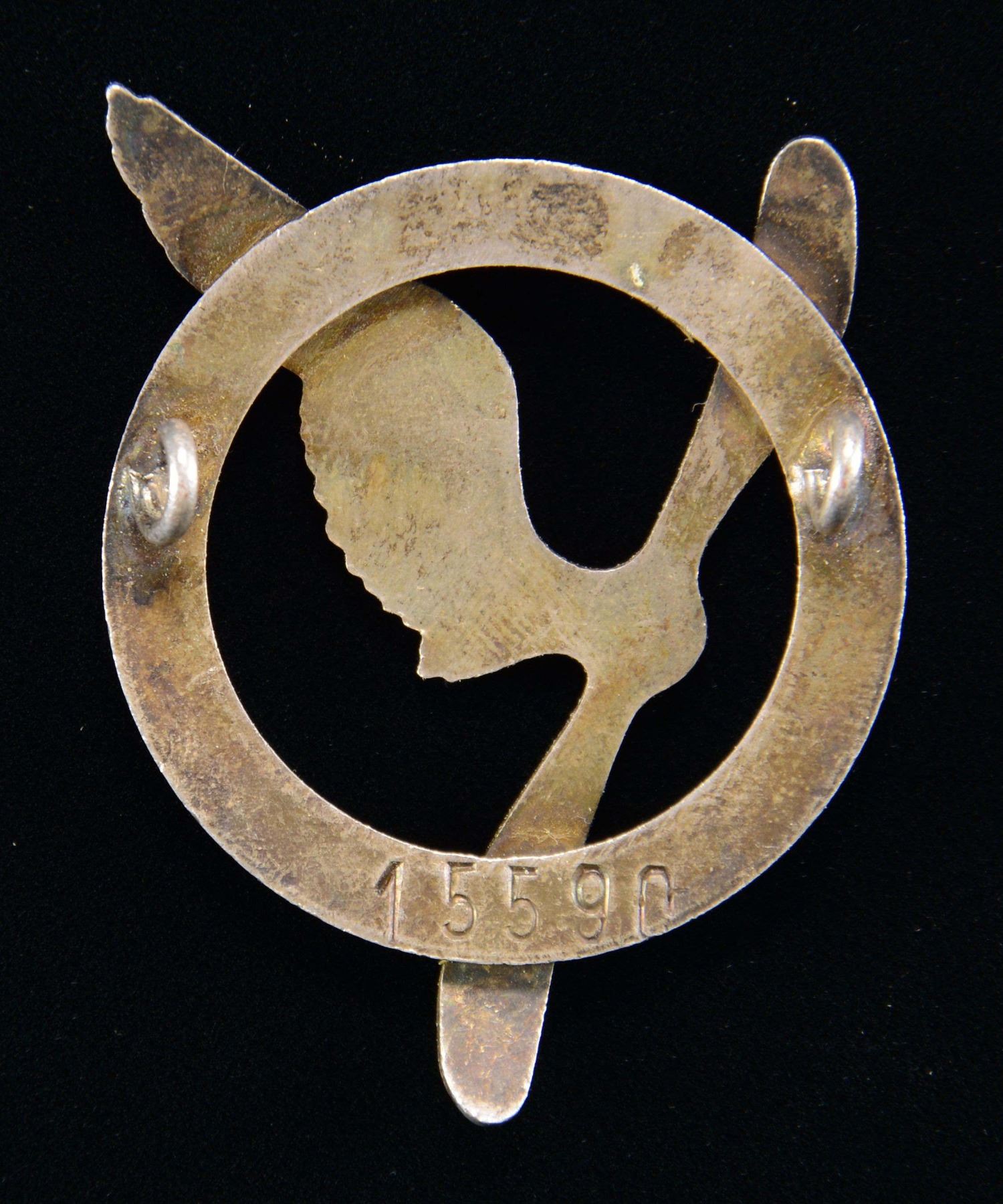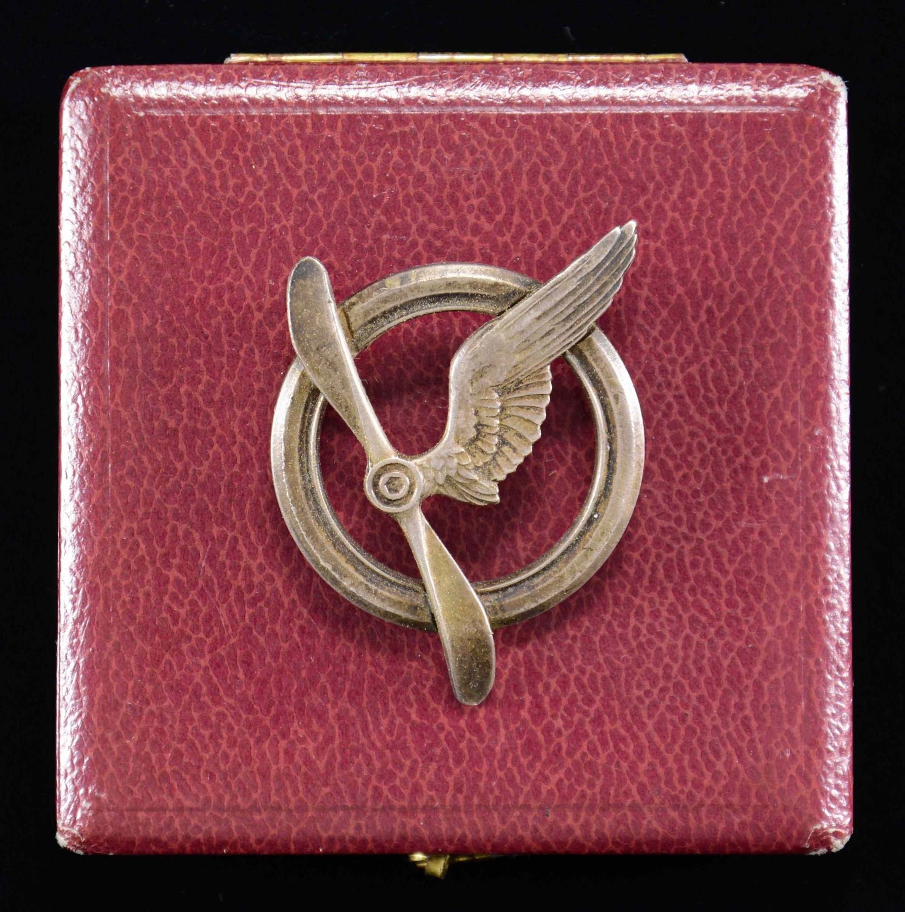 This badge measures approx. 1 3/4" x 1 3/4" with a silvered finish, likely dating from about 1925. It depicts a propeller with a single extended bird’s wing superimposed over a circle. The rear of the badge has two loops, and the circle is numbered "15590." The badge is housed in a red leather case, marked on the inside "ARTHUS BERTRAND PARIS." CONDITION: badge shows light overall wear. (02-22992/BF). $800-1,200.