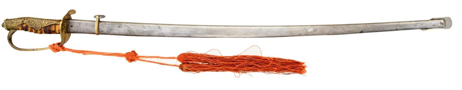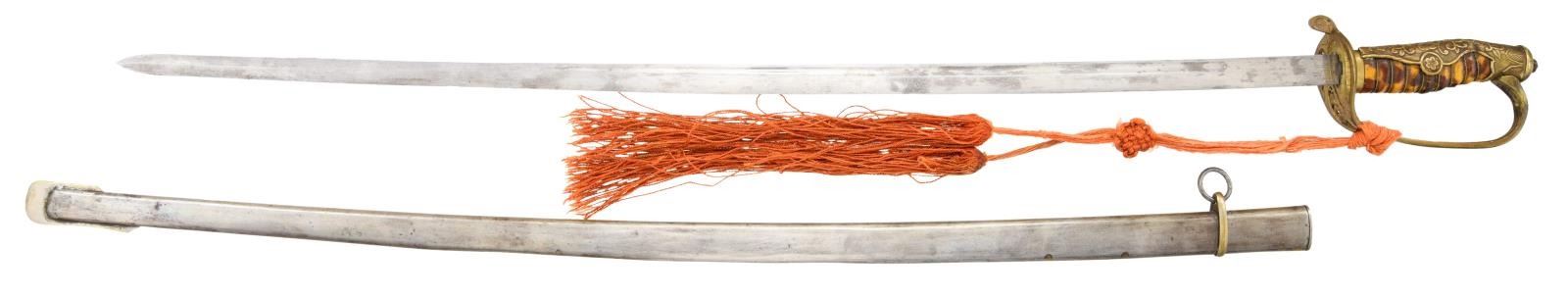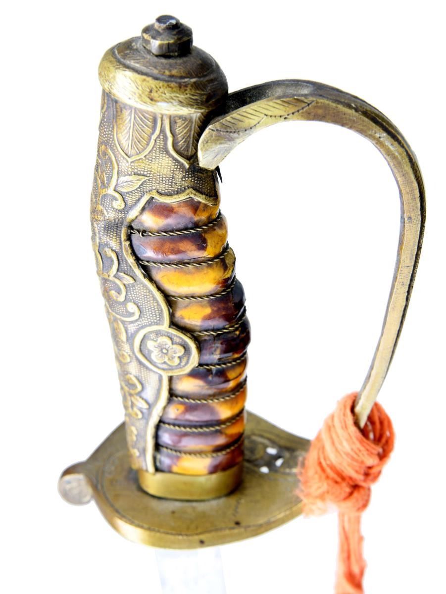 Overall length: 36 1/2". Blade length: 29 3/8". Plain blade with a single narrow fuller. Brass hilt with a turned down quillon. Guard has simple floral piercings with a plain knuckle bow. The backstrap is embellished with cherry blossoms and a foliate motif. There is a nut at the top of the pommel. The grip appears to be wire wrapped faux tortoise shell. The guard has orange colored sash/knot attached. Plated iron scabbard. CONDITION: blade has a light gray finish with scattered light staining. Hilt is quite loose. Grip is complete but worn. Scabbard has an overall gray patina and is undamaged. PROVENANCE: From the Lifelong Collection of Glen E. Mattox. (02-18416/BF). $200-300.