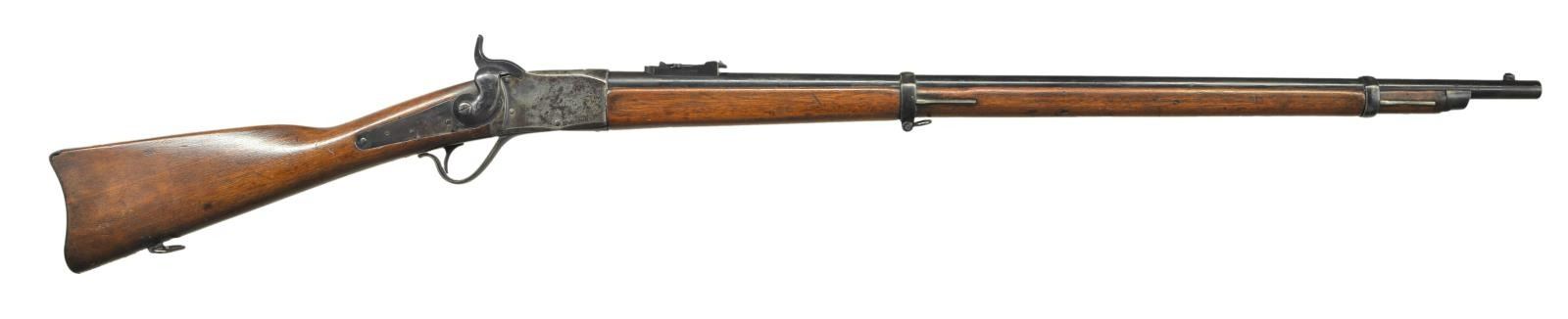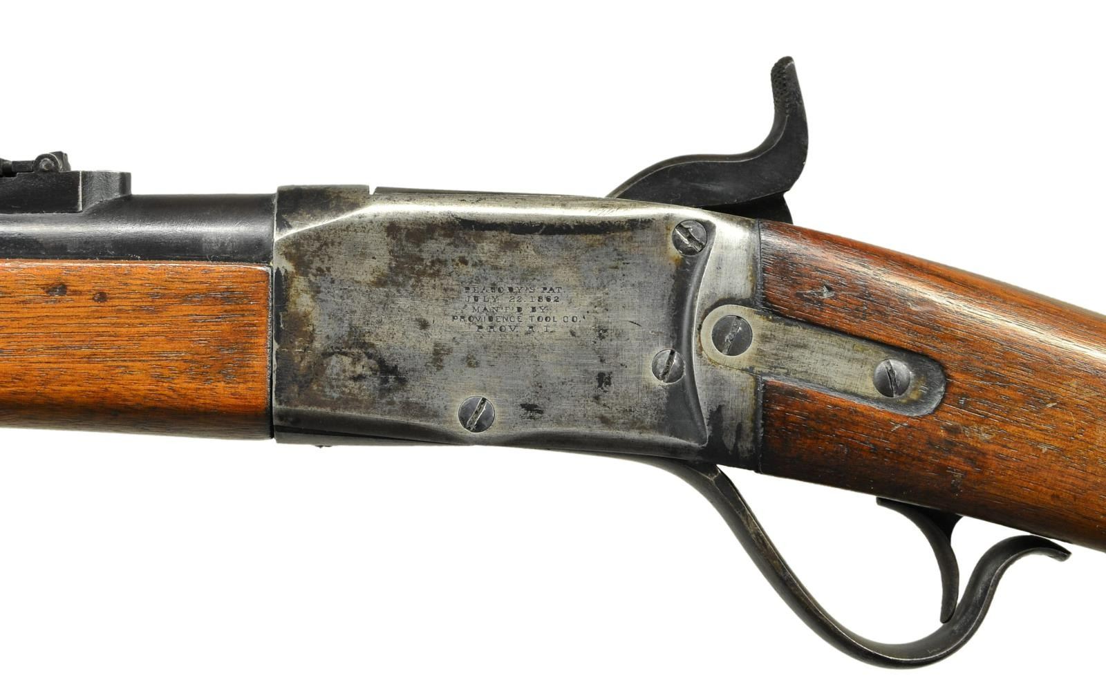 Cal. 43 Spanish. S# NSN. Bbl. 33" w/ ladder rear sight graduated to 1200 yards. Stud type front sight. Outside hammer single shot military type rifle. Receiver is marked on left side "PEABODY'S PAT. JULY 22, 1862 MAN'F'D BY PROVIDENCE TOOL CO. PROV. R.I.". Bbl. w/ 2 bands retained by springs. Bottom swivels. Ramrod is not present. 2 piece walnut stock set. Buttstock is marked on left side of grip w/ sm. oval cartouche having illegible letters. Military style buttplate. CONDITION: stock set has arsenal rework type finish w/ added finish over wear, staining & handling marks. Metal has turned overall gray & patina. Bbl. has worn blue / black touch up finish. Bore is shiny w/ strong lands but has areas of fouling & fine pitting. PROVENANCE: From the Lifelong Collection of Glen E. Mattox. (01-22541/RW). CURIO. $400-600.