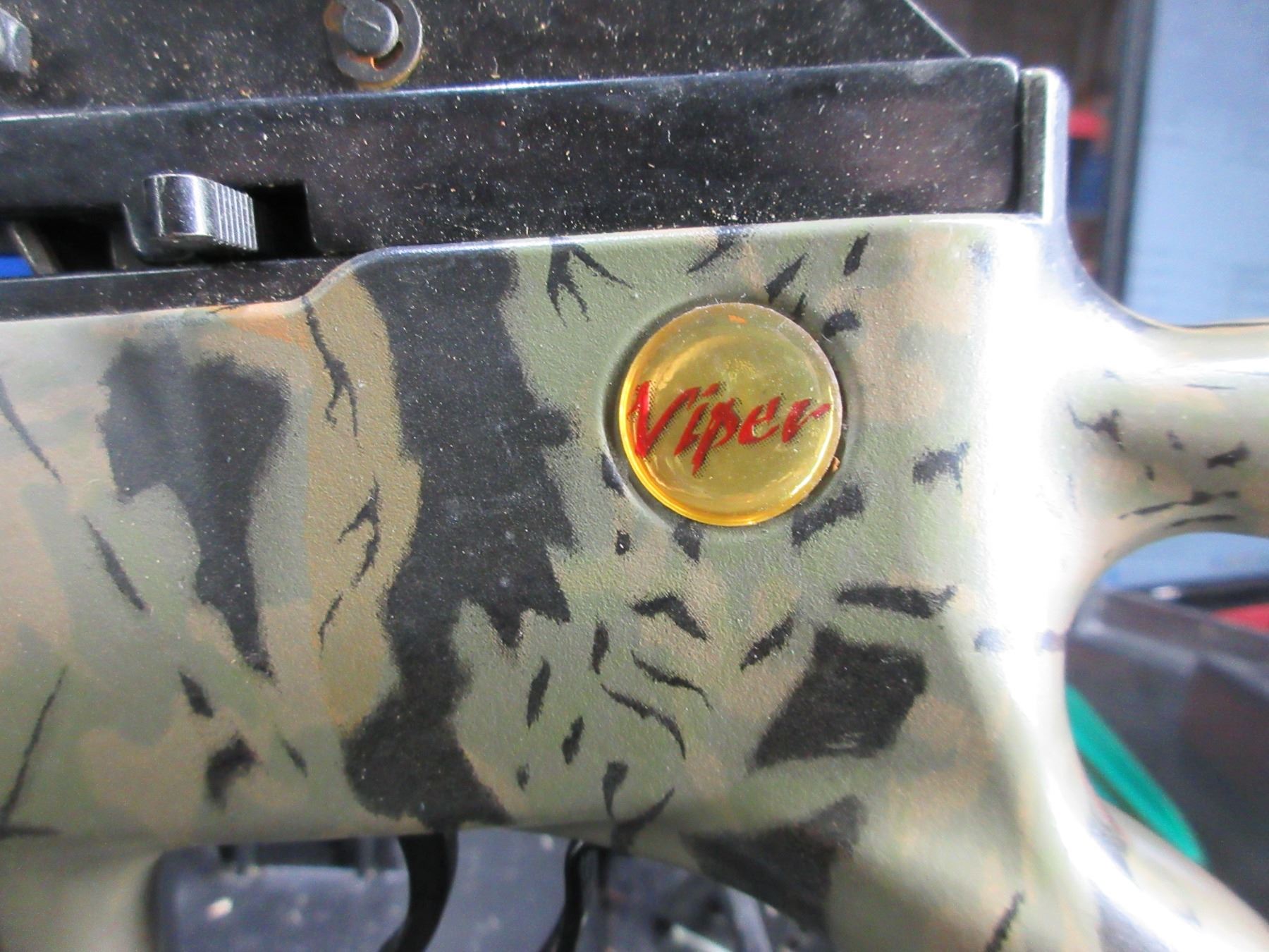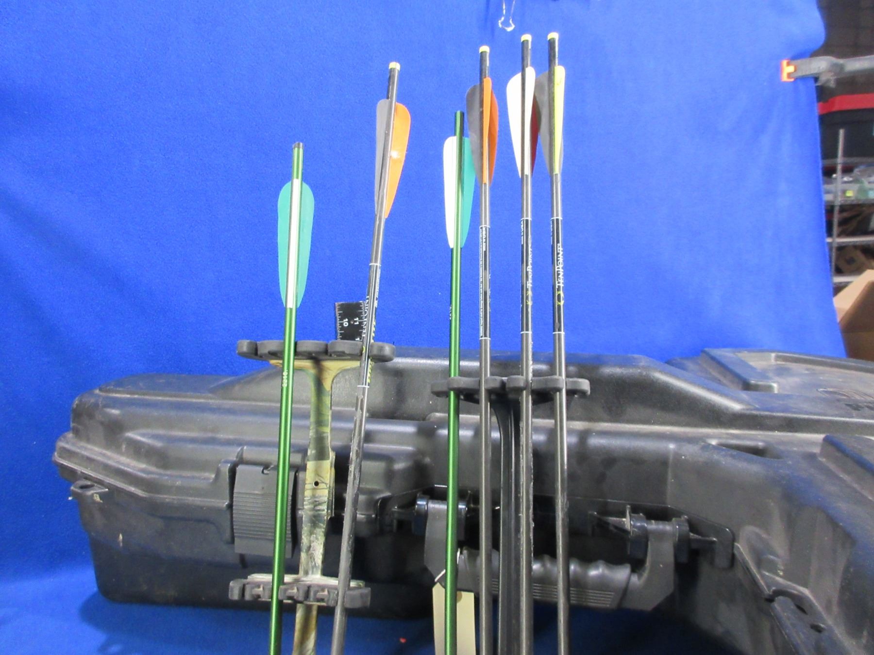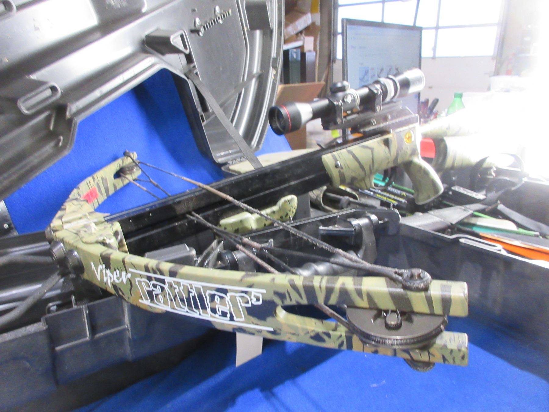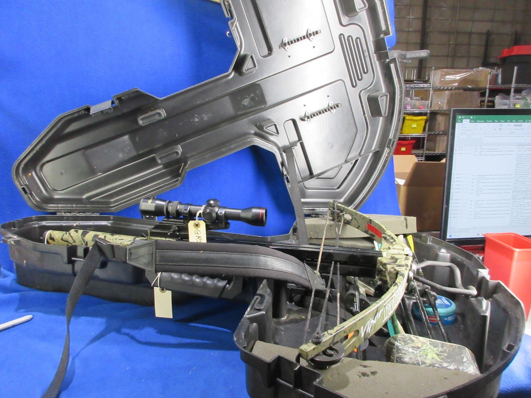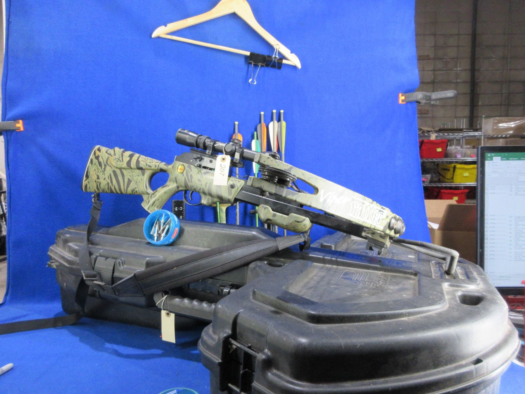 PSE Archery Viper Rattler' Camo Crossbow - 165 lb Draw Weight - Comes with Plano Pillarlock Hard Case (2 Latches are Missing), Excalibur 250-350 Crossbow Scope (Appears Clear), 6 Bolts, 2 Quivers and 3 Broadheads - Right side limb has 2 chips