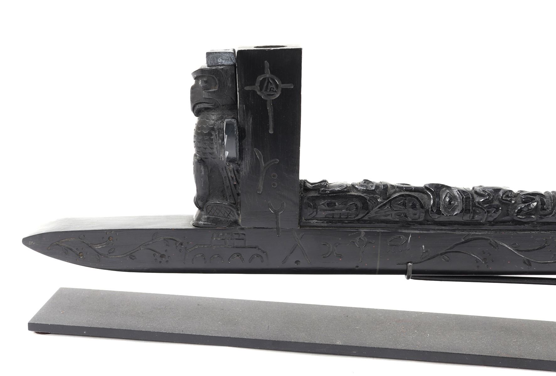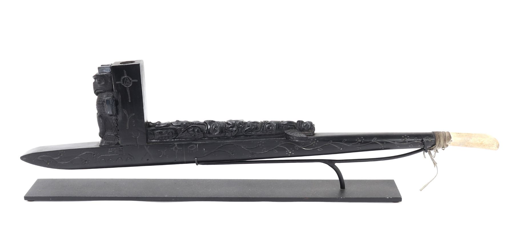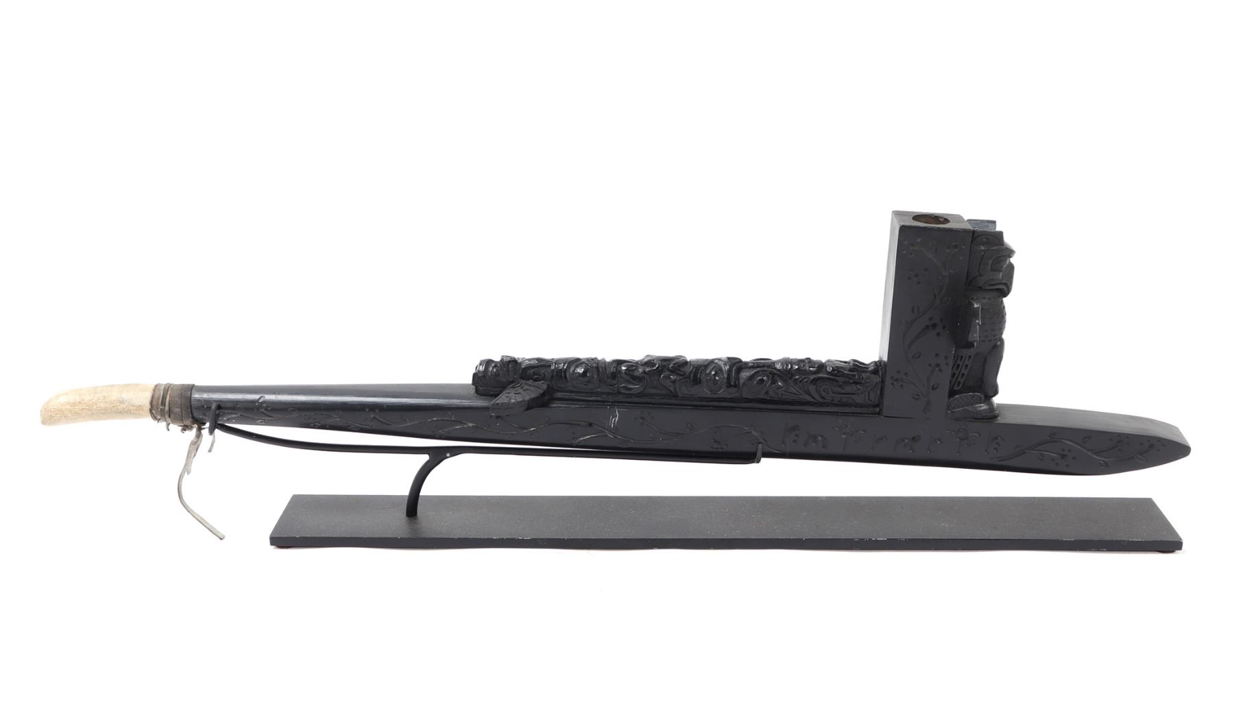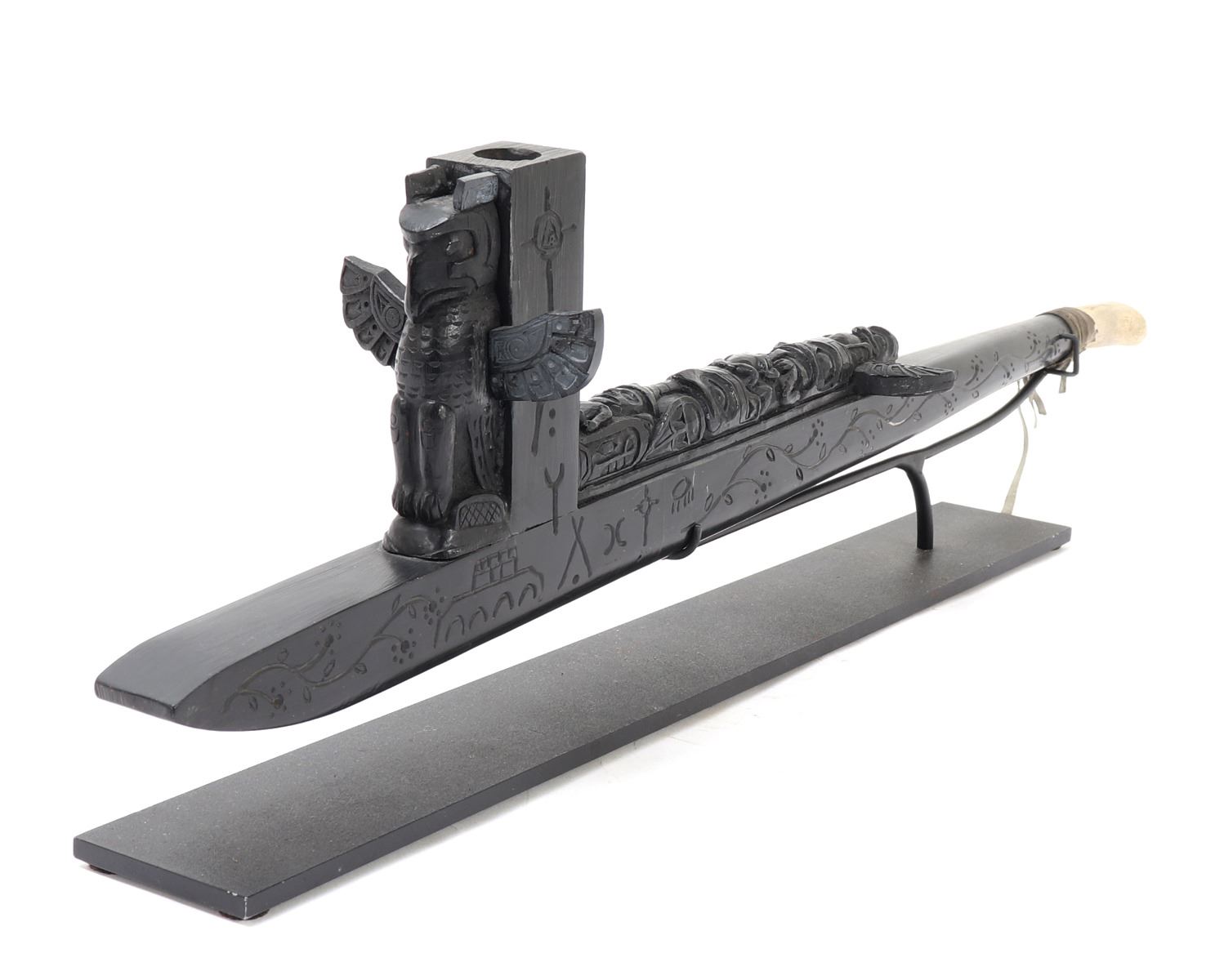 Native American, Pacific Northwest coast, Haida. Wonderful example of an argillite peace pipe extensively decorated with totemic creatures, a proud Thunderbird with outspread wings before the vertical chamber. Amazing added incised floral vines and indigenous clan symbols throughout the body of the pipe. Wonderful totem pole on the top of the pipe features a Thunderbird, a bear, a frog with elongated tongue, and a handsome raven. Size 26" L x 6" W x 4" H, weight 1110g. Condition: Minor wear to bone mouth piece, tooling marks indicating it was made prior to 1890.. Provenance: Private Newport Beach, California, USA collection