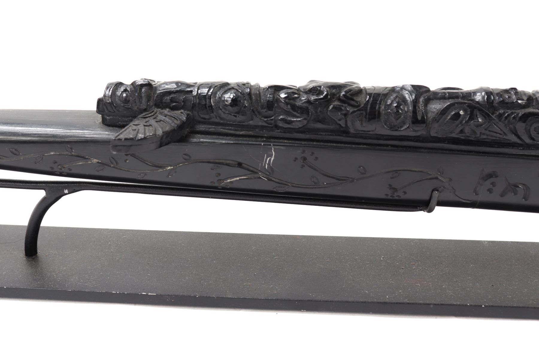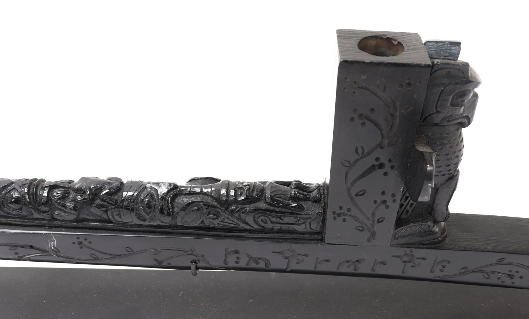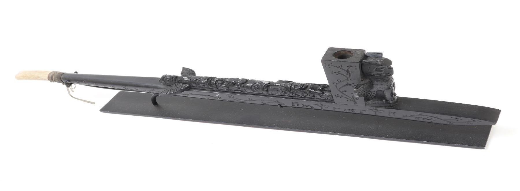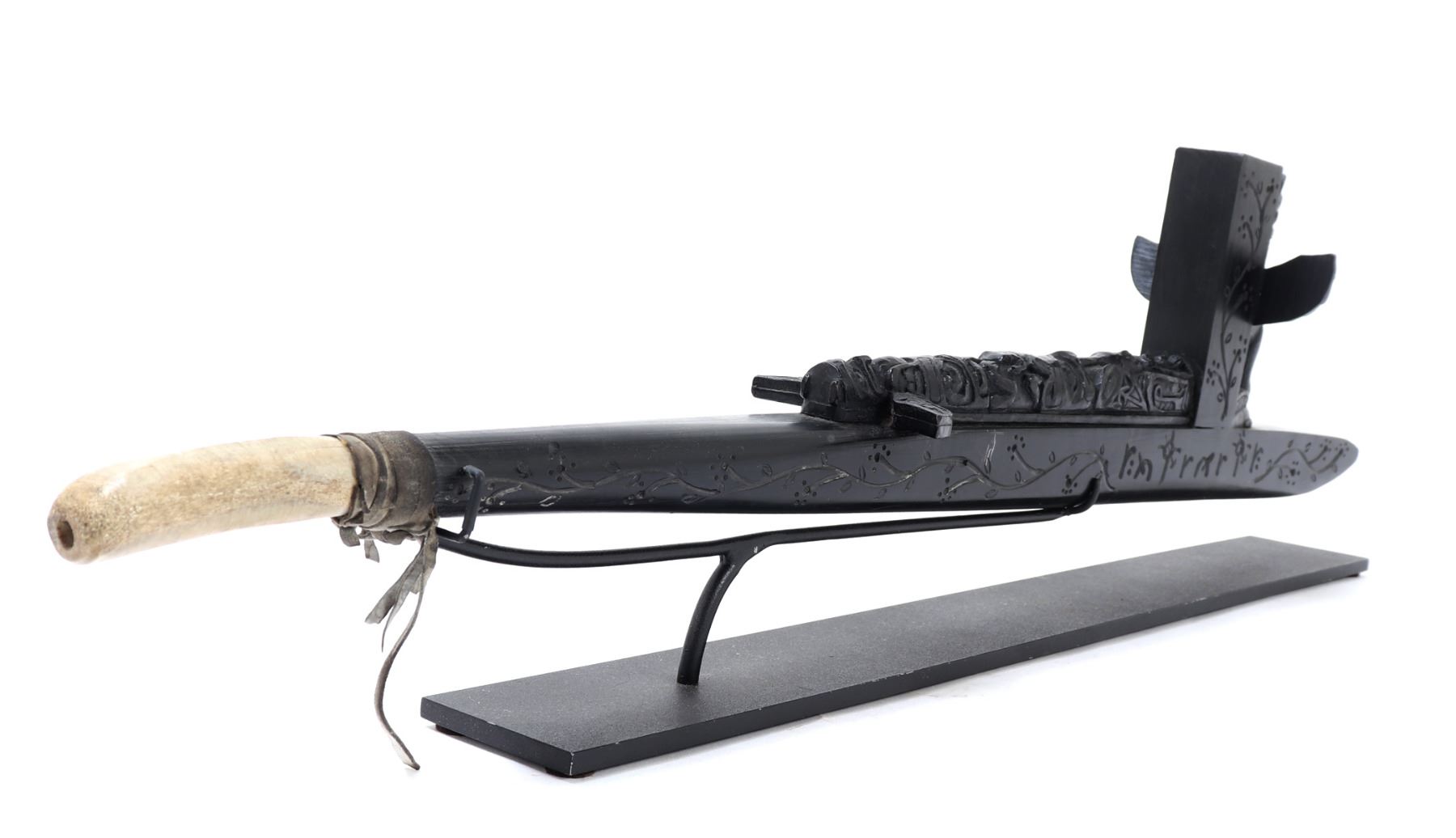 Native American, Pacific Northwest coast, Haida. Wonderful example of an argillite peace pipe extensively decorated with totemic creatures, a proud Thunderbird with outspread wings before the vertical chamber. Amazing added incised floral vines and indigenous clan symbols throughout the body of the pipe. Wonderful totem pole on the top of the pipe features a Thunderbird, a bear, a frog with elongated tongue, and a handsome raven. Size 26" L x 6" W x 4" H, weight 1110g. Condition: Minor wear to bone mouth piece, tooling marks indicating it was made prior to 1890.. Provenance: Private Newport Beach, California, USA collection
