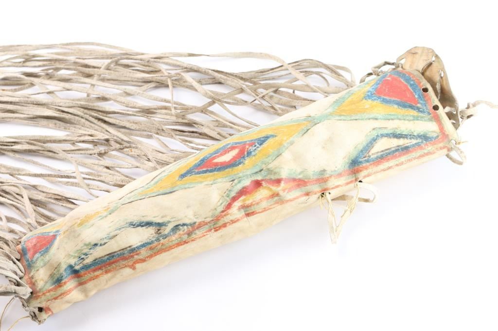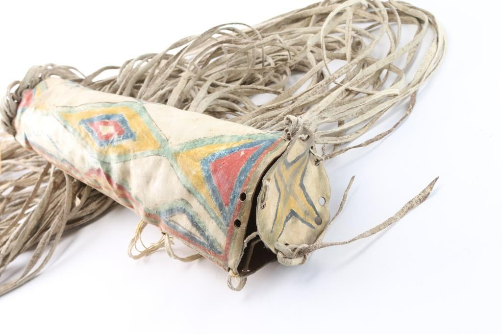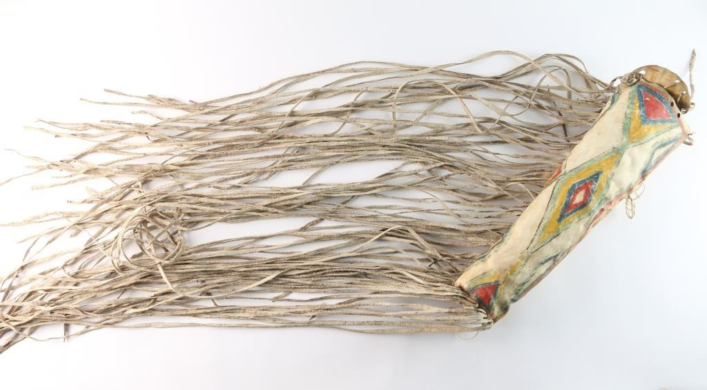 With attached lid and long rawhide fringe. Late 1800 to early 1900. Measures 19". A parfleche is a Native American rawhide container embellished by painting, incising, or both. Envelope-shaped parfleche have historically been used to contain items such as household tools, or foods such as dried meat or pemmican. They were commonly made in pairs and hung from saddles. Their designs may have once served as maps.