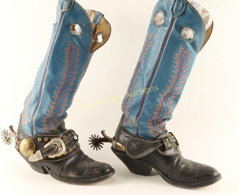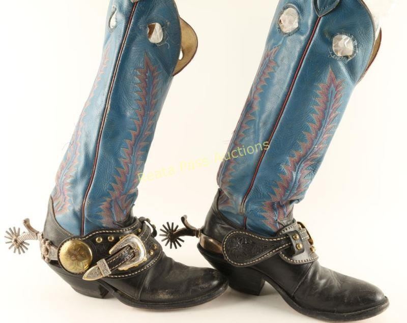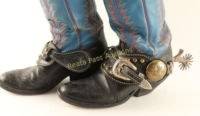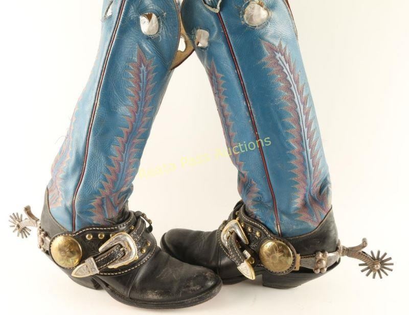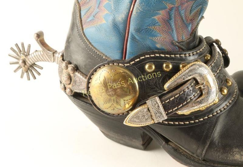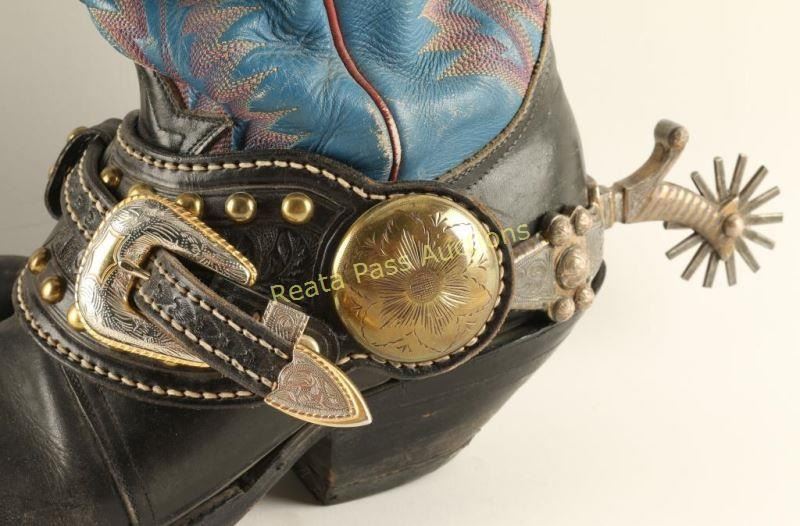 Great pair of heavy silver engraved and inlaid spurs with excellent hand tooled leather straps that are studded featuring engraved buckle and large brass engraved concho with boots from "Arizona Kid" collection of Carlos Hadaway famous Western artist.