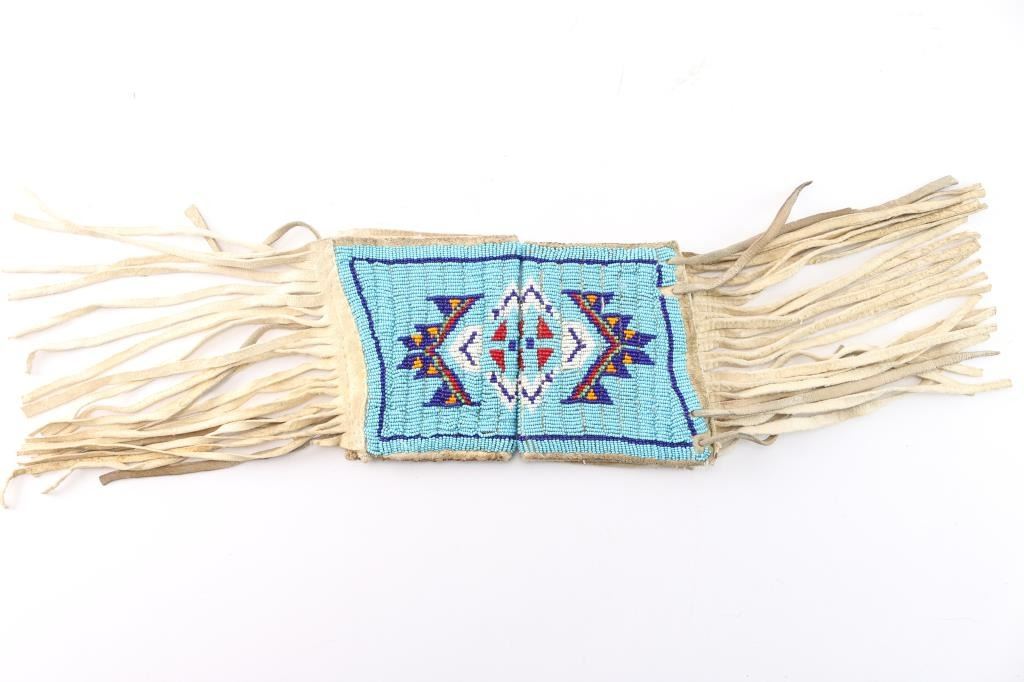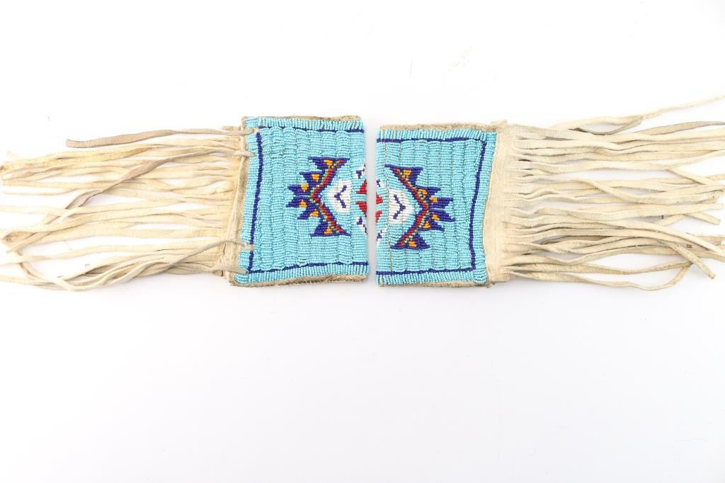 Pair of rawhide cuffs measure 9" end to end with fringe measuring 8 1/2", and light blue beaded background with white, dark blue, red, green, yellow design.