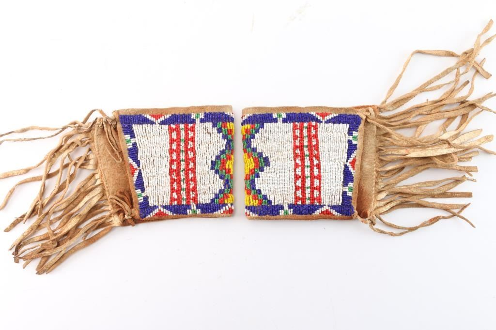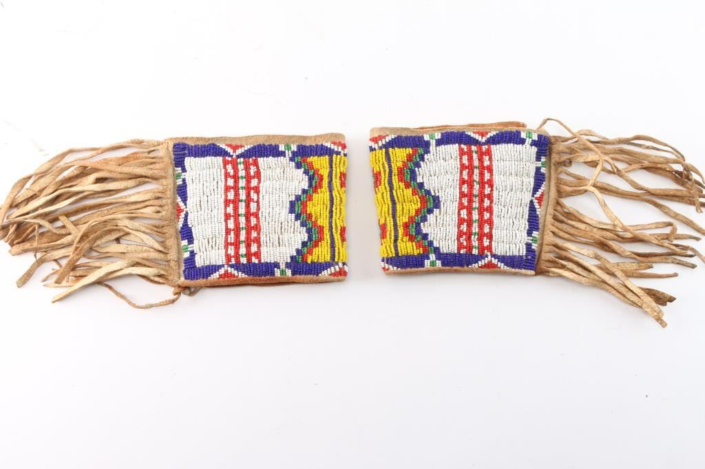 Rawhide cuffs measure 9" end to end with fringe measuring approximately 4 1/2", with white, blue, red, green, yellow beadwork.