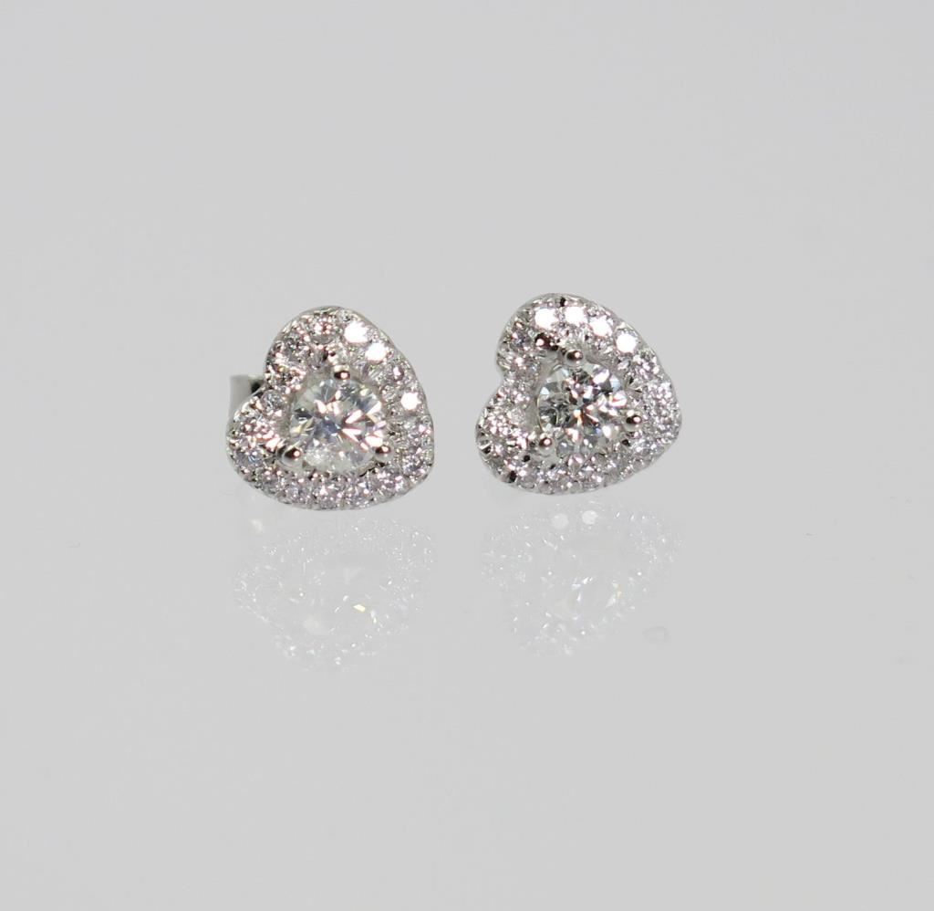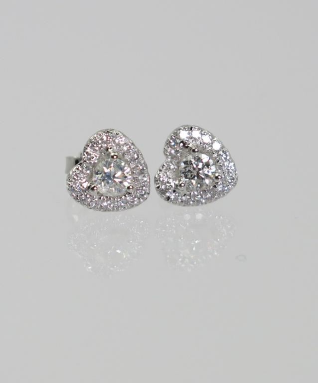 Features two "IDEAL" round cut diamonds encircled with 34 round cut diamonds with F-G colors and SI clarity. Diamond weight approx 0.80 carats total set in 14 karat white gold.
