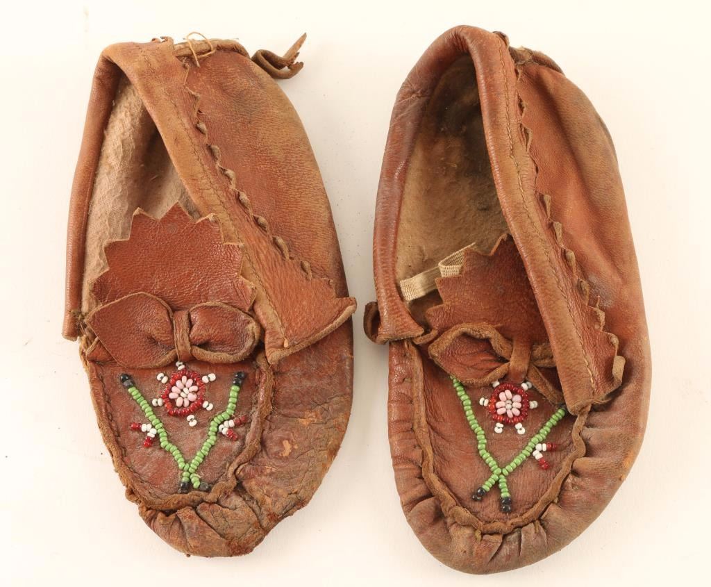Tan leather with beaded floral motif. They measure 3"w x 6 5/16"l. There is a hole at the end of one moccasin