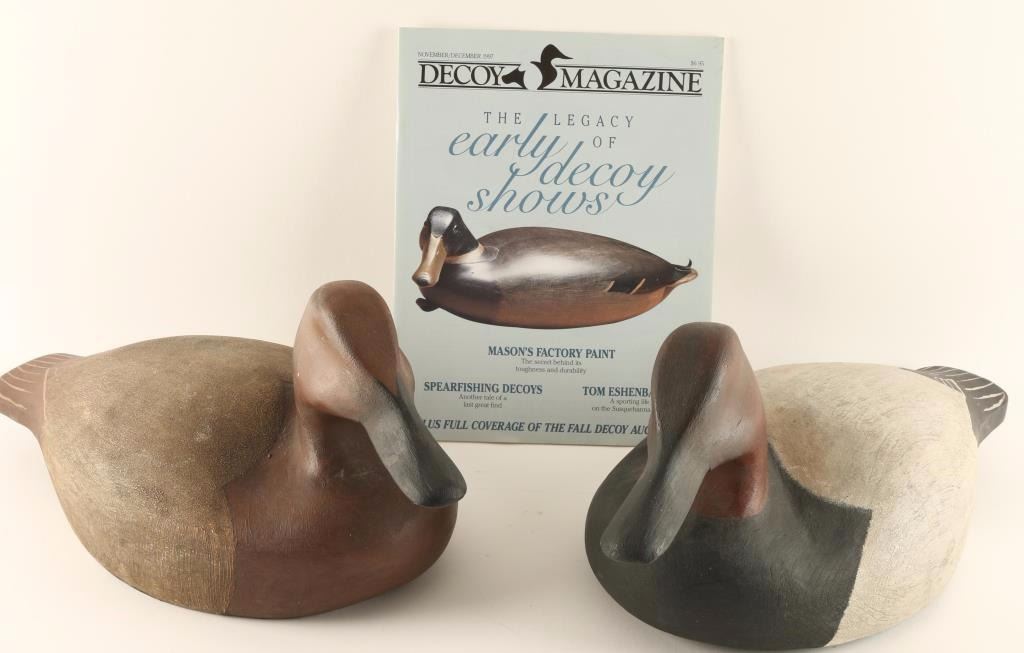 All wood construction handcarved and painted hen and drake redhead ducks Signed 'TWE' on bottom along with brass plate that has name and address of artist. Measure approx. 8"h x 7"w x 16 1/4"l from tailfeathers to beak. Includes a 1997 issue of "Decoy Magazine" with information on the artist.