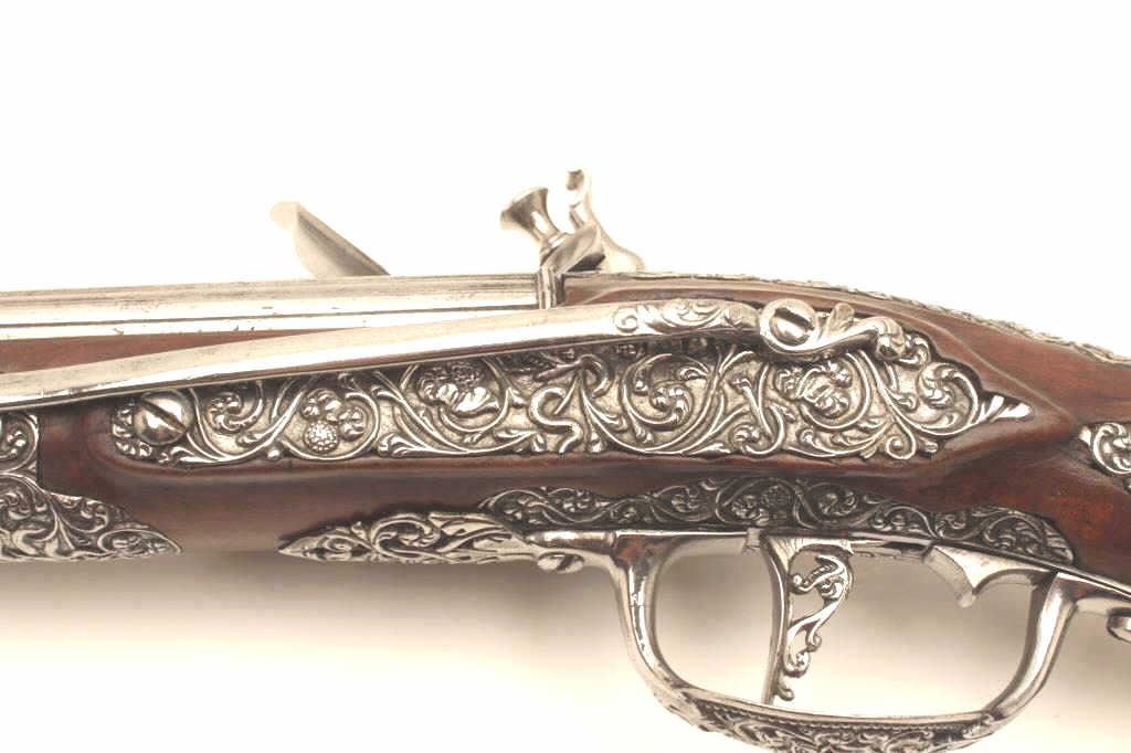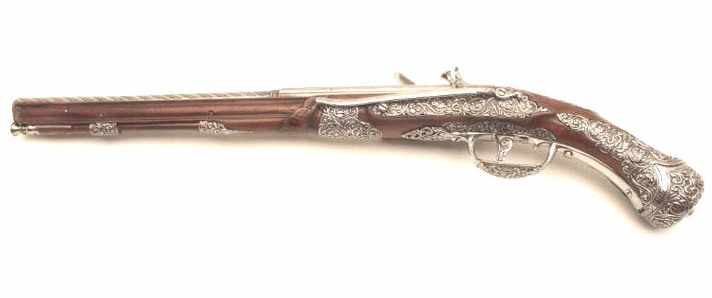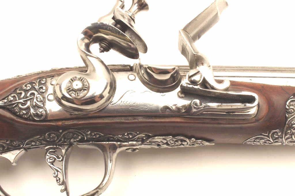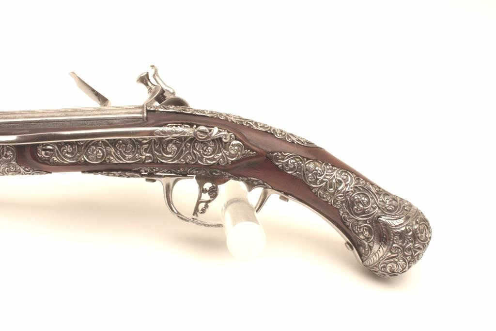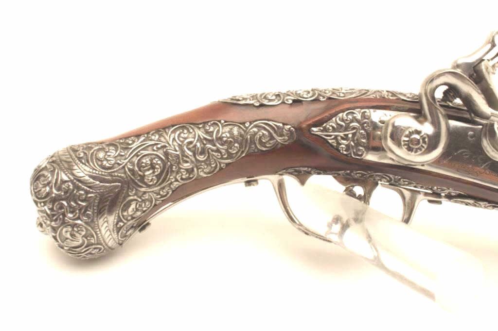 Pair of Gio Bonazo Italian high art flintlock pistols with fantastic high art chiseled steel decoration. Lazarino Comminazzo signed barrels. Measures 20” overall with 12 ¾” barrels of approximately .56 calibersmoothbore. Original flintlock with correct belt hooks and ramrods retained. (Antique) Est.: $10,000-20,000