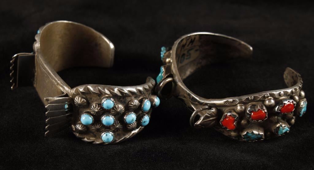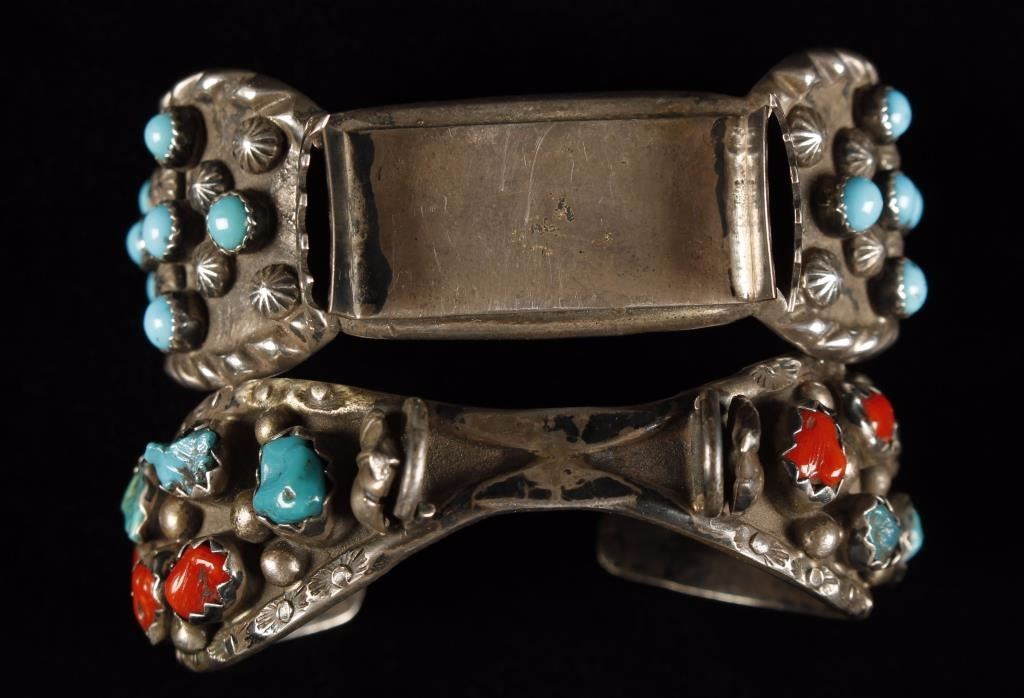 Accented with turquoise and red coral set in Sterling Silver, unsigned.