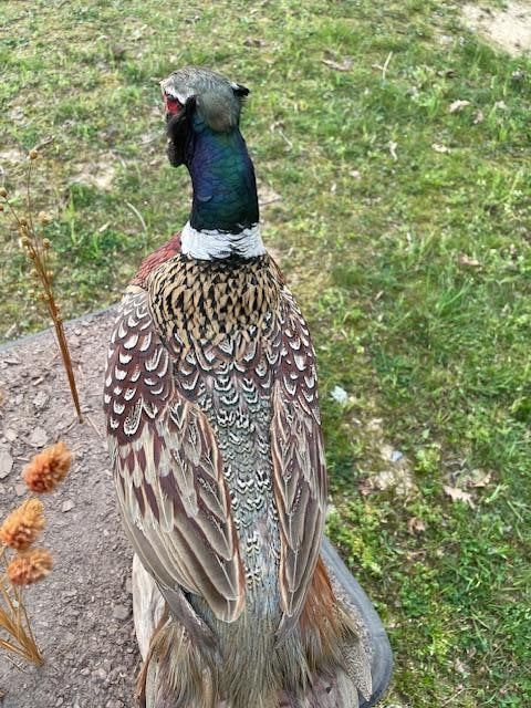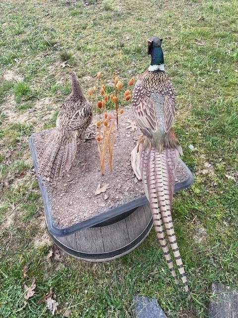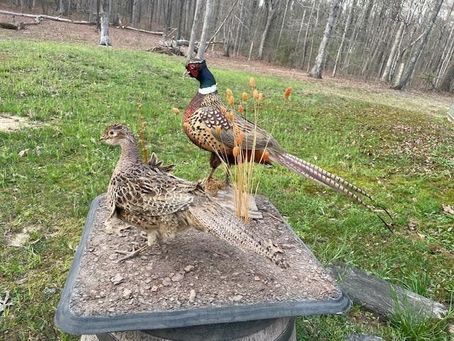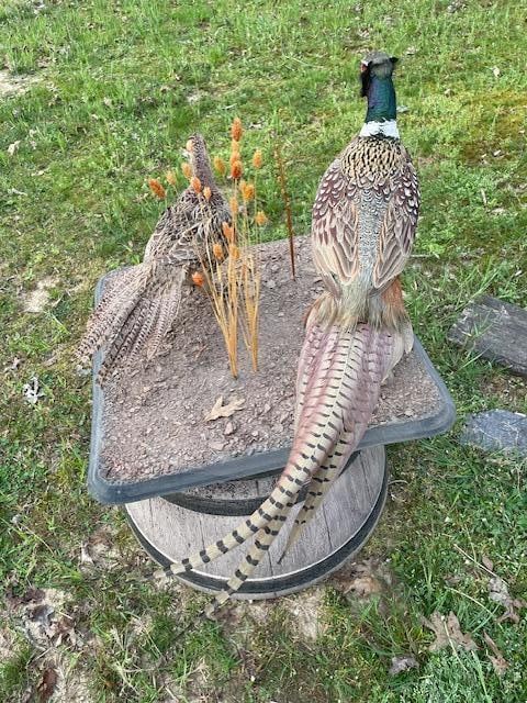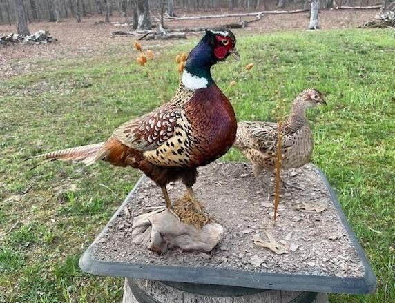 Beautiful Pair of Male and Female RING-NECK PHEASANTS. They are displayed on a Natural Base Setting that measures 24" Long x 24" Wide. The Male Pheasant measures 32" Long x 18" Tall. This is an Awesome Taxidermy display! TAXIDERMY BIRDS