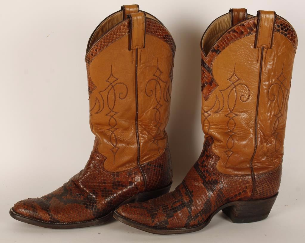 Brown/black snakeskin size 8 1/2 D. Stitched butterscotch leather uppers with snakeskin trim. Good condition shows a little wear.