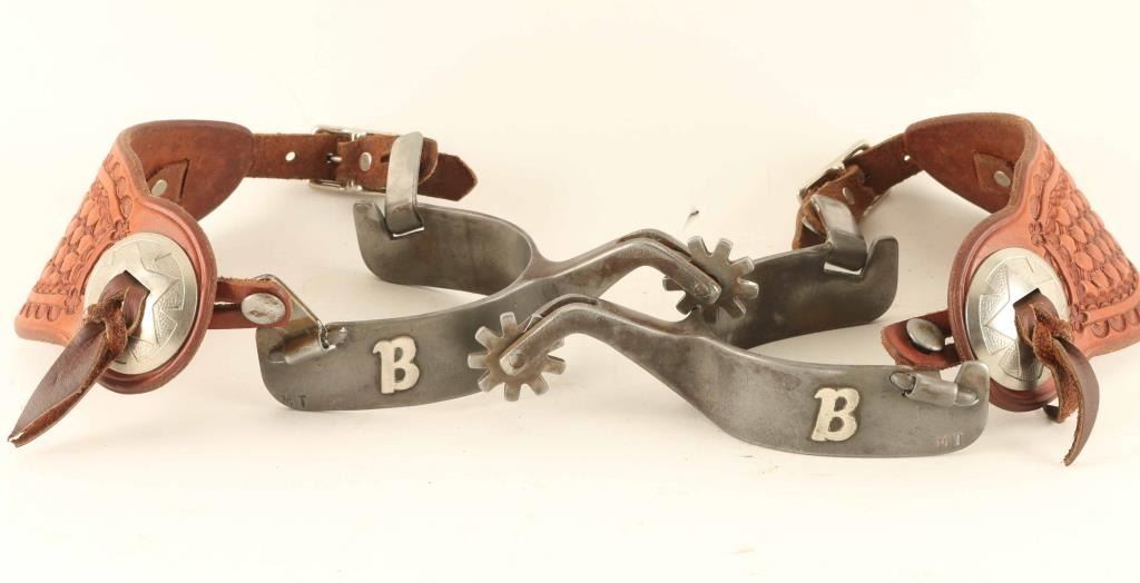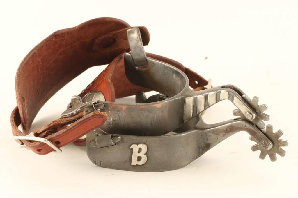 marked "MT" with the "B" monogram on the heels includes leather spur straps with a basket weave design.