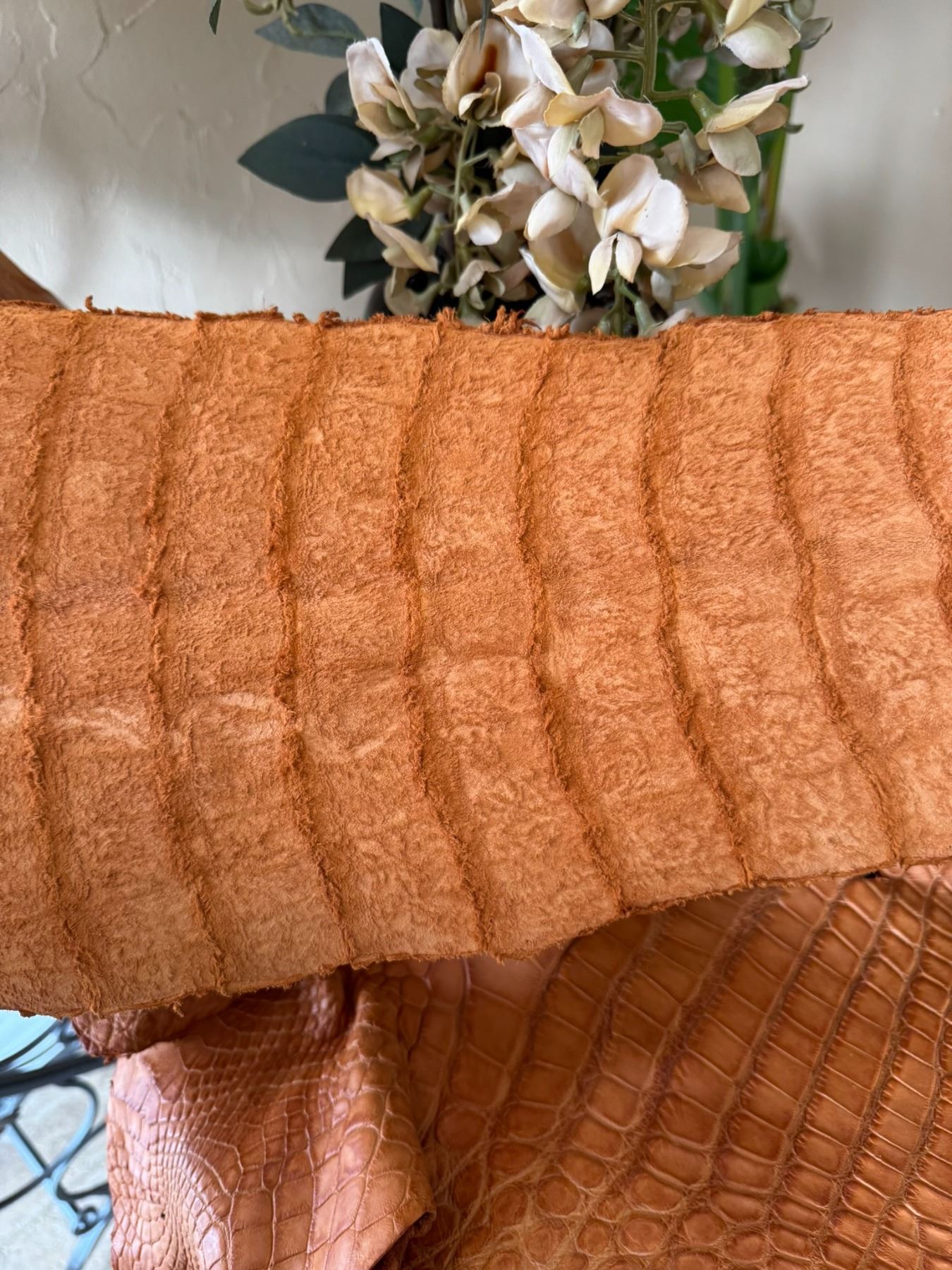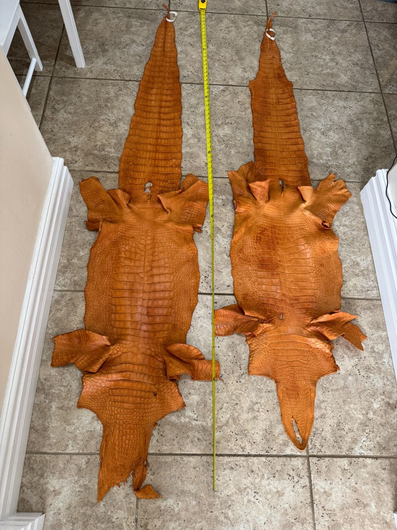 Description: Harvested from Southern Louisiana and professionally skinned, tanned, and dyed these American Alligator hides are a must have to add to your collection. The perfect material to create whatever leather goods you would like or simply to add a trophy or decoration to your home. Soft tanned with a velvet like finish on the underside, this is a stunning conversation piece. The peanut brittle dyed color is a rich beautiful color! Tanned gator leather hides are perfect for upholstering luggage, furniture, seats, or any item you can dream up! Turn these hides into stunning custom leather alligator boots for $1000. We also have additional hides available to purchase if you need more in bulk! Shipping is not included in this package! Exact hides are pictured here.