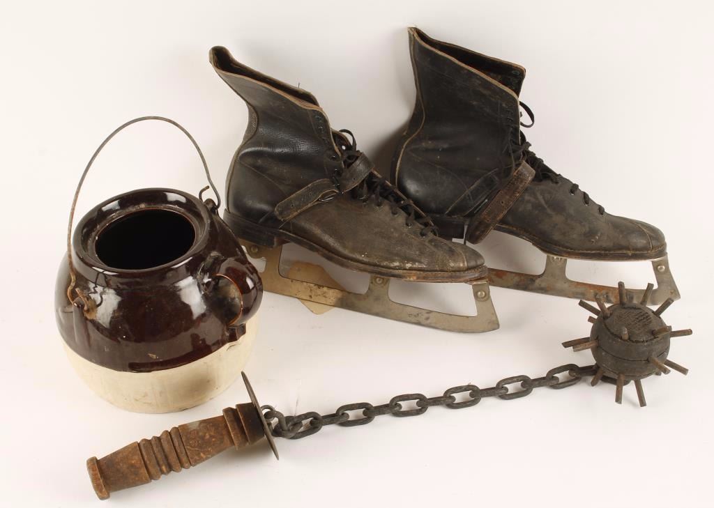 Ball and chain has wood handle and metal spikes. Includes stoneware jug. Bonanza lot!
