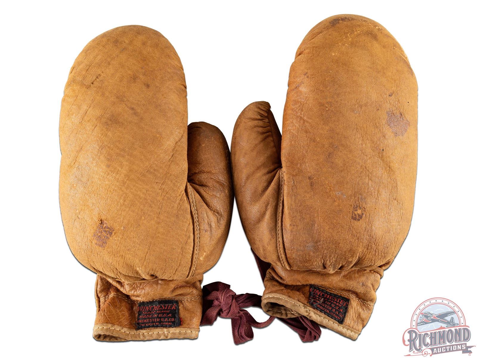 Winchester boxing gloves for boys from 12 to 14 years old. Constructed of leather with durable padding and a flat-palm grip. The gloves have general age and usage wear including scuffs, stains and scratches but are free of holes. Lacing appears to be replaced. Winchester stampings are clear and legible. Both gloves retain the sewn Winchester tag. 9.5" H x 6" W x 2" D.