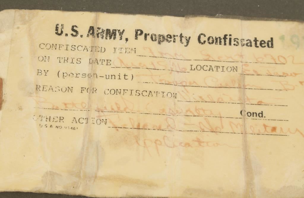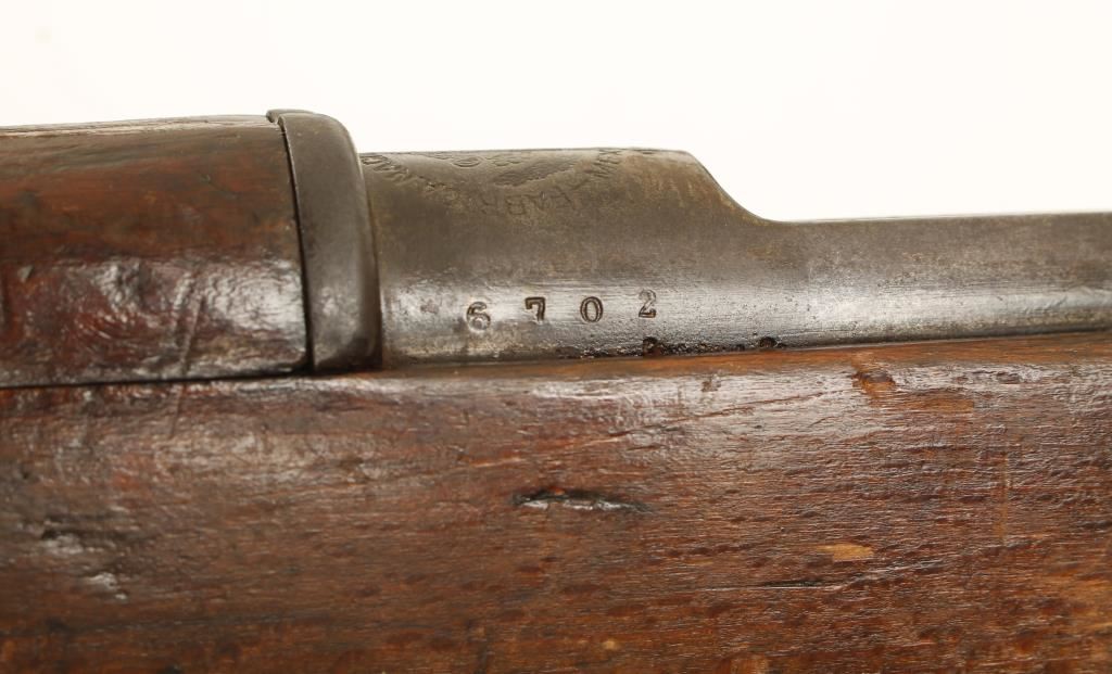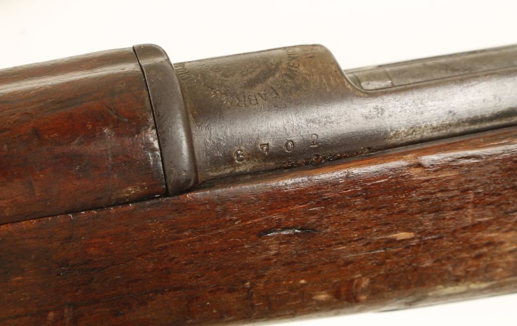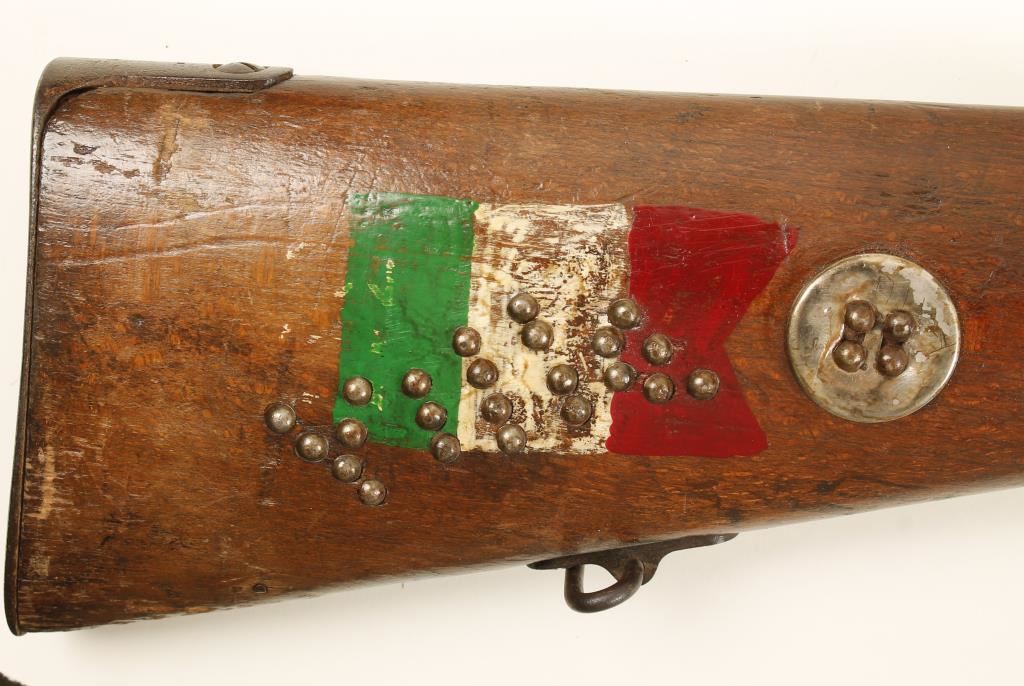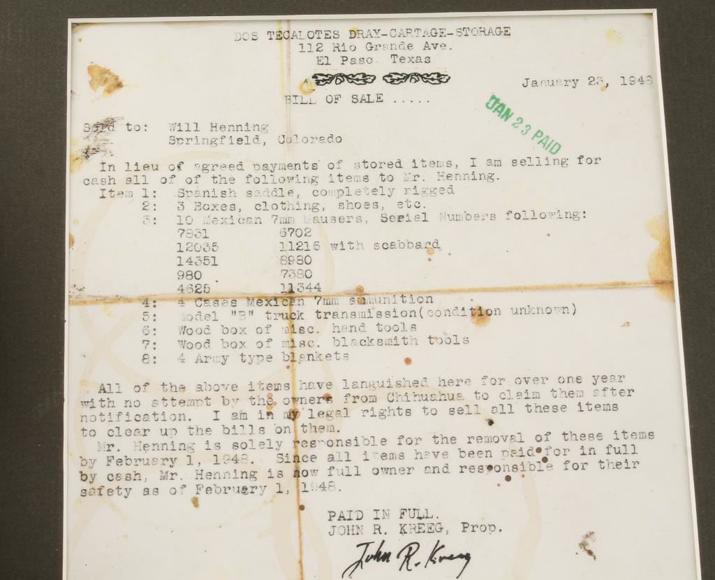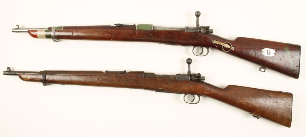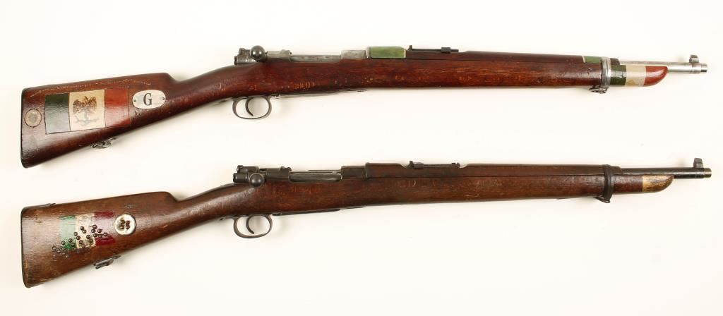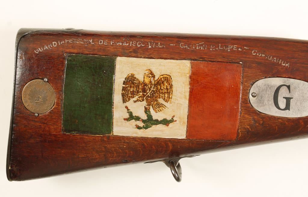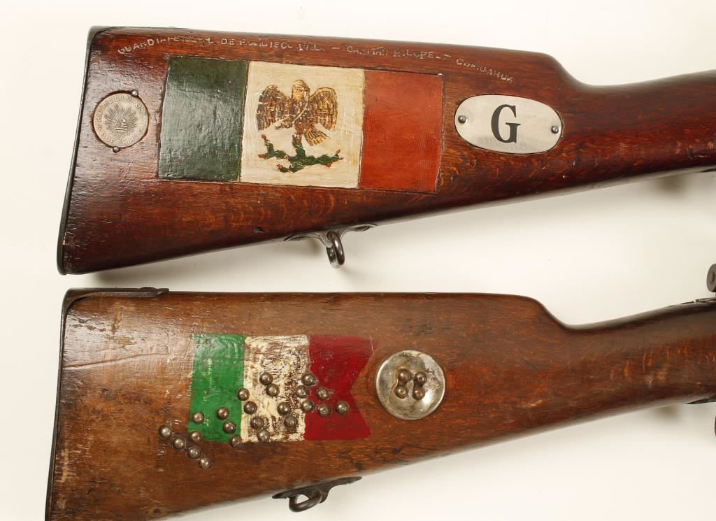 Two rifles reputed to be used by the bodyguards of Pancho Villa. Both are Mexican model 1910 rifles made at the Mexican National Arms Factory in 1912 and 1914 respectively. This lot includes a U.S. Army Property Confiscated tag which lists a 7mm Ser# 6702 and a letter from an El Paso storage facility which lists both serial numbers as having been sold as abandoned goods in 1948. Rifle 6702 has a 20' barrel with bluing gone to brown with scratches, dings and rust stains. Bore is dark and pitted. Stock has a crude Mexican flag painted on the butt with tacks spelling out "Villa" over it. The forend tip is painted with gold paint. The stock has dings, rubs, scrapes and scratches. Action works well. Condition is poor. Rifle 11216 has a 20" cut-down barrel with finish gone to bare metal with rust stains or brown patina. Floor plate is marked "Guardia Personal de Francisco Villa".The bore is frosty with good rifling. The stock has the Mexican flag painted on it with an oval tag bearing the letter "G" on it and a coin from the state of Chihuahua. Stamped into the stock is"Guardia Personal de Francisco Villa - Capitan R. Lopez - Chihuahua". The other side of the stock has an oval tag with the number "9" on it. There is an added on saddle ring and staple in brass. There is a green blaze on the left side of the stock. The rear of the handguard is painted green with a white line and the front end of it mirrors that. The forend of the stock is painted in the colors of Mexico. All the wood has some battering and there is a crack at the rear of the upper tang and two cracks (maybe repaired) on the rear of the hand guard. Action works well. Condition is poor to fair. *Modern Firearms*