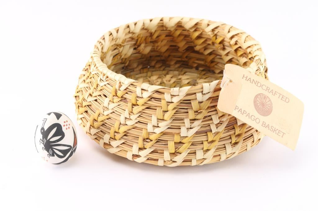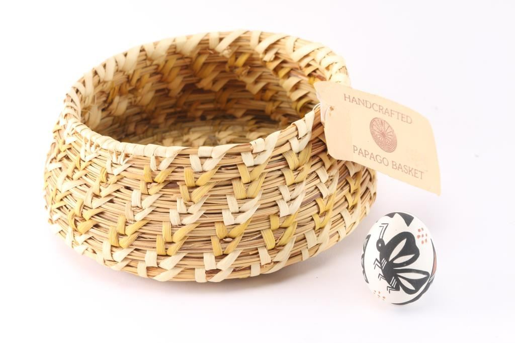 Modern basket measures 3 1/4" tall by 6 1/2" diameter, in good condition. The pottery egg measures 2" and 1 1/2" diameter, is signed C. P. on bottom and features a butterfly, kokopeli and geometric design.