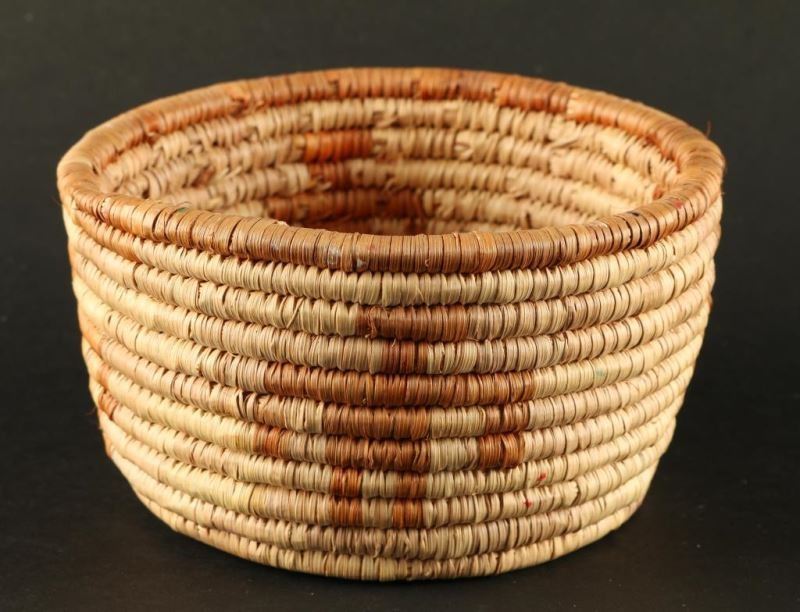 Small basket with burnt orange rim and four figures woven into it. Measures 3 1/4"h x 5 1/2"dia. Good condition.