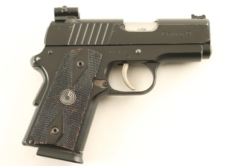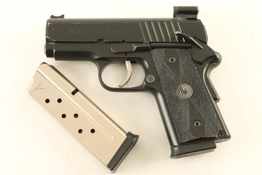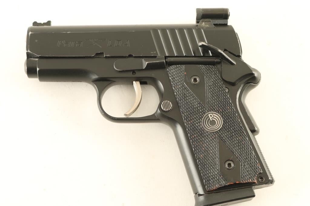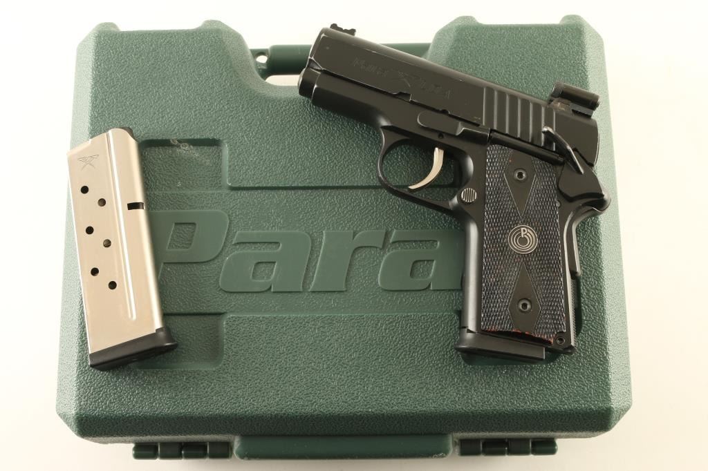 Canadian made semiautomatic pistol imported by Para USA Inc of Ft Lauderdale FL. Features slim frame with single stack magazines, matte black finish, black checkered grips with Para logo, 3" barrel, blade front sight with fiber optic insert, square notch rear sight with white outline, laser module with two cylinders straddling the rear sight, manual safety, grip safety, double stack magazine. Operates using the Para-Ord LDA (light double action) trigger which provides a light and smooth trigger operation, no restrike capability. Bore is excellent. Retains 90% finish with scratches, bare metal showing on sharp edges. Grips are good condition, appear to be painted wood. Includes factory plastic box, manual, (2) magazines Condition is NRA Very Good++ *** Modern Firearm ***