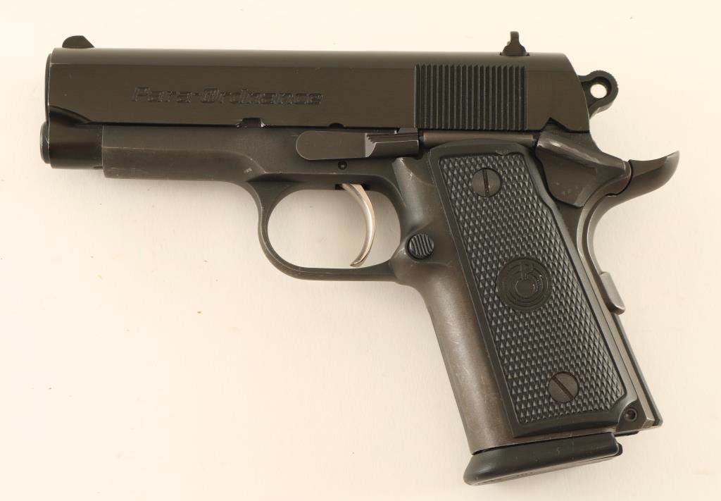 'Light Double Action' Canadian made double-action-only semi-automatic 1911-A1 style compact pistol chambered in .45 Automatic. Features a black/parkerized finish, 3.5" barrel, patridge front sight with white dot, dovetailed rear window sight with two dots, smooth trigger, serrated round hammer spur, thumb safety, beavertail grip safety, push button magazine release, 12 round double-stack factory magazine, serrated front strap, serrated flat mainspring housing, and two-piece checkered black plastic grips with Para Ordnance insignias. Pistol exhibits approximately 80% of it's original finish with the majority of the finish loss on the frame, showing honest wear. Action is strong, bore is excellent and plastic grips are near fine. Condition is very good. ***Modern Firearm***