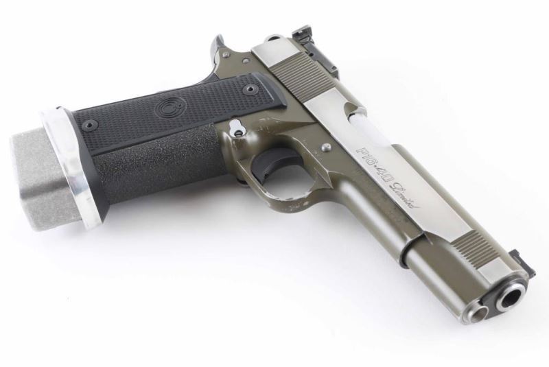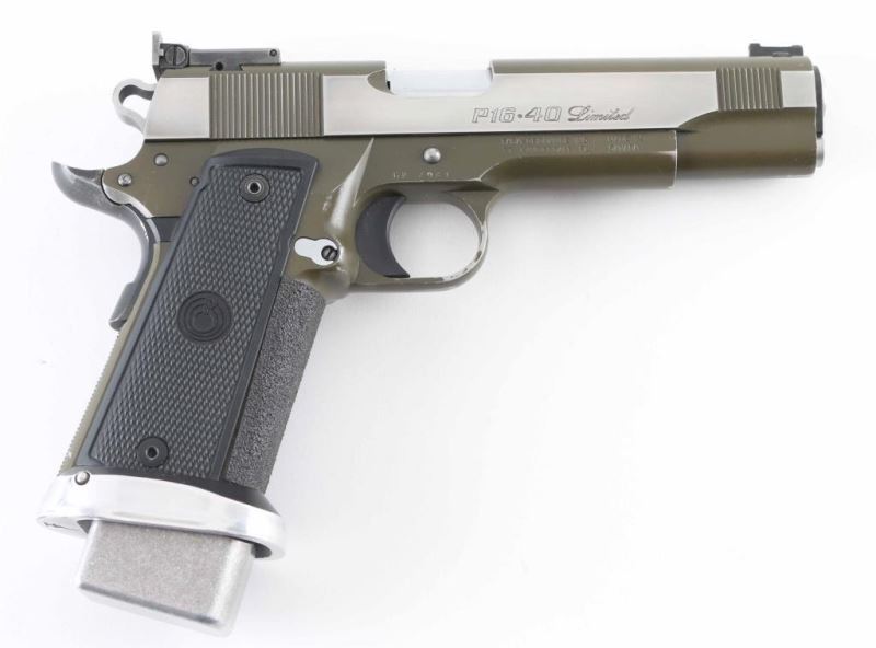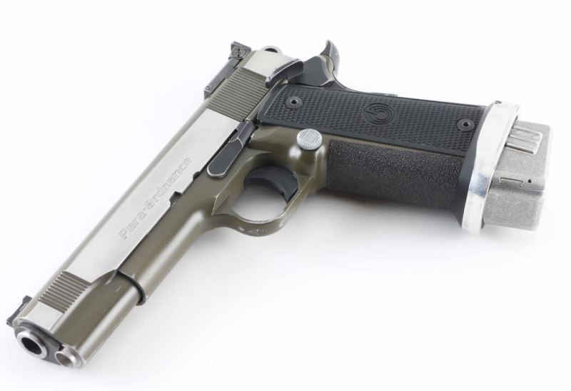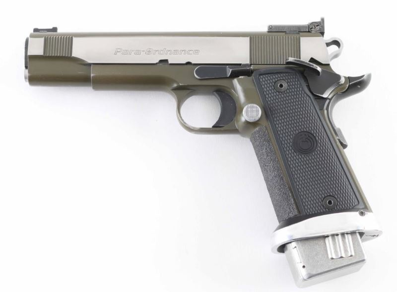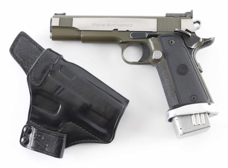 SN: HN4961 Canadian made semiautomatic pistol imported by Para-Ordnance Inc of Ft Lauderdale FL. Features wide "double stack" frame, 5" barrel, full length recoil spring guide, blade front sight, adjustable target type rear sight, manual safety, upswept grip safety with memory hump, oversized push button magazine release, cocking serrations at front and rear of sides of slide, extended and flared magazine funnel, flat checkered mainspring housing, textured panel on front strap. Pistol has been coated with an olive green color finish, polished away at sides of slide. Front sight is broken, with fiber optic insert missing. Bore is very good condition. External surfaces appear in very good condition, with wear to green color finish from handing & use. Includes (1) magazine with alloy base, good condition black leather Galesi inside the waistband holster. Condition is NRA Very Good *** Modern Firearm ***