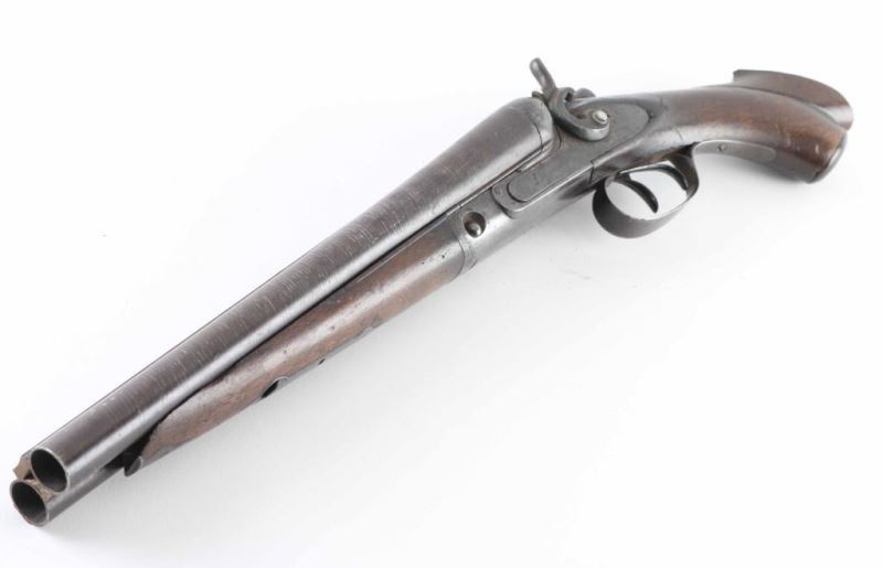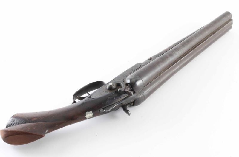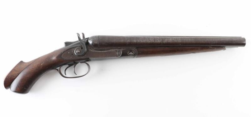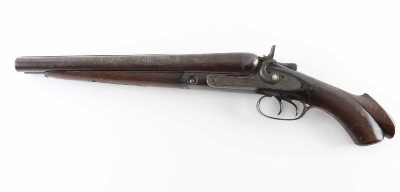 This is a parts only non functioning antique double barreled, sidelock, shotgun circa 1882. The hammers don't function and neither do the triggers. The hammer screw on the left side has been replaced but not with an original. The action locks up tight. It has twist barrels as designated on the rib of the shotgun. There is no grade mark on the watertable. The serial number on the barrels match the forend and watertable. The barrels have been cut down to 12.5" and the stock has been cut down as well. At one time the stock had checkering but has been rubbed away in most spots by years of handling. The stock is cracked at the wrist from the left side plate to the tang. The grip cap is still intact but worn. A little TLC and you have a great gun for the mantle or bookcase. Antique NRA Poor Antique Firearm