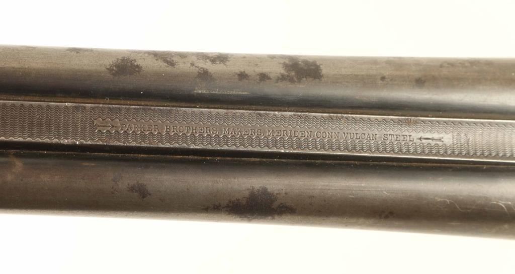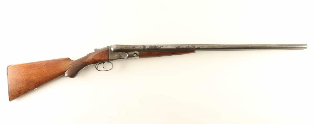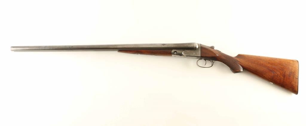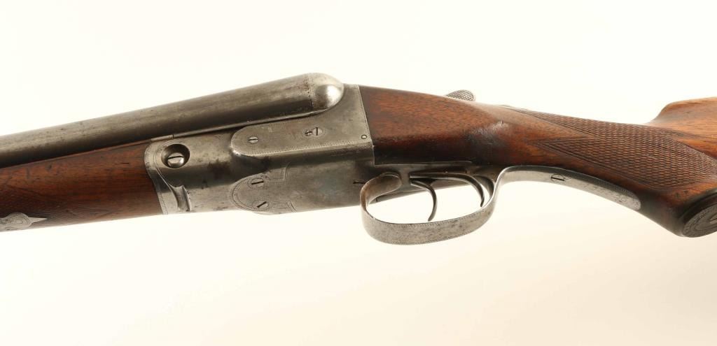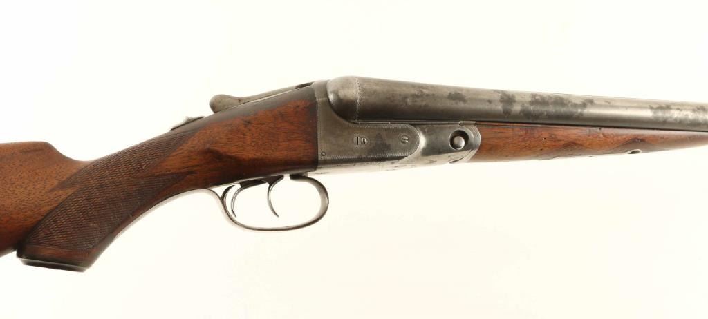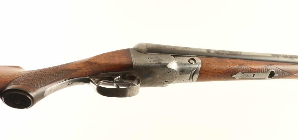 Side by Side box lock double gun features 27" fixed choke barrels (both measure CYL) with steel front bead, extractors, double triggers, tang safety, semi-pistol grip butt with checkered wrist and checkered "Dog's Head" logo Gutta Percha type butt plate, checkered forend. Receiver has limited border pattern engraving. Retains 20% coverage of thinning bluing, darker in protected areas, with patches of dark colored smooth patina on barrels. Bores are Very Good. Barrels appear shortened, no filler in spaces between barrels & ribs. Wood is good condition with some light stains and signs of use and handling. Inset monogram shield on butt toe line (unmarked). Measurements: 14-1/8" Length of Pull, 1-7/8" Drop at Comb, 2-7/8" Drop at Heel. Condition is NRA Good+ *** C&R Firearm ***