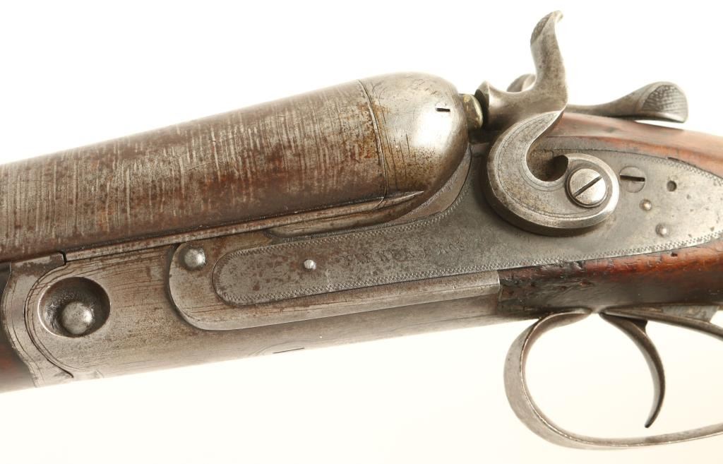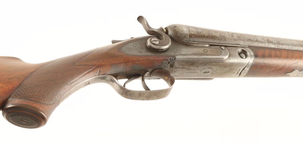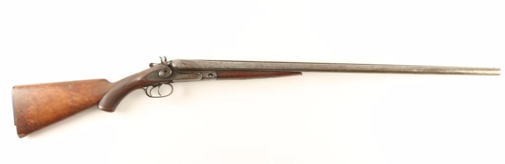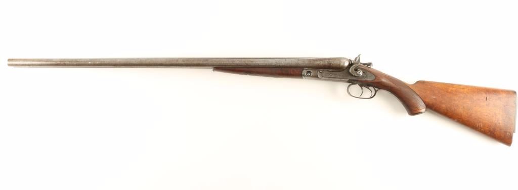 Early double barrel side by side shotgun chambered for 12 gauge shells. Features 30" damascus barrels with concave rib, bead front sight, exposed hammers, extractor, lightly engraved receiver, checkered top lever, double triggers, checkered walnut forend and pistol grip shoulder stock with bakelite buttplate & silver shield escutcheon. Barrels retain most of their damascus pattern with a darkening brown patina, case hardened receiver has turned to a grey/brown patina with scattered dark oxidation. Action performs well, bores are very good and checkered wood stocks have been worn smooth with a chip at the toe of the shoulder stock & buttplate. Condition is good+. ***Antique Firearm***