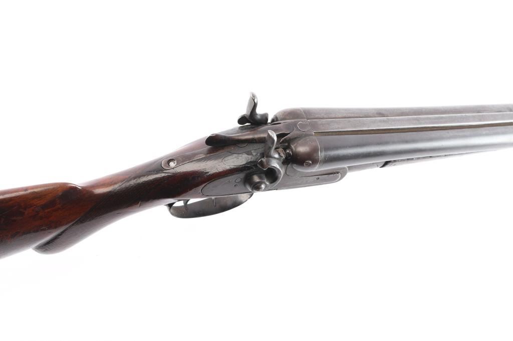 Antique, Belgium made side-by-side double-barrel 12 Gauge shotgun. Features 30" Laminated Steel barrels, brass bead front sight, checkered splinter forend, checkered walnut shoulder stock with round knob grip, checkered buttplate, single extractor plate. Chokes measure Improved Cylinder, and chamber measure approx. 2-3/4". LOP is 14-1/4" to forward trigger. Bores have good luster with scattered pitting. The finish shows a patina overall w/ spots of varnish on the receiver. Barrels show an even smooth dull dark gray color and rust spots towards the top and middle. Tiny scratches to muzzle, and several shallow dents observed to barrels. Wood forend is in fair condition, with a large crack and some losses to edges, chips at back end. Smoothing of the checkered area and secured to forend w/nut and screws. Stock is fair, re-varnished, scratched & dented, smoothing of checkering, no noted cracks around tang. Action has some play in lock-up, ejector spins freely, screw head on the upper tang appears to have been drilled-out, "PARKER & CO" engraved on plates, along is stamped with clear even depth and evenly space. Wall Hanging Condition. *** Antique Firearm ***