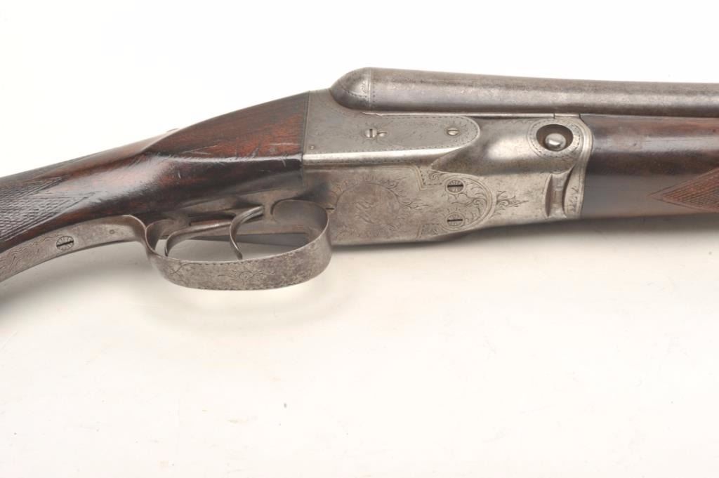 Parker GHE grade Damascus steel barrel SxS shotgun S/N 152756 with 30” barrel choked full and modified. 14 ¼” pull with Parker butt plate. In good to very good original condition showing traces of original finishes on the metal and sound stocks with fairly sharp checkering. Locks tight with descent bores showing little erosion and aging. Ejectors work well. (Antique) Est.: $800-$1600