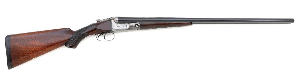 serial #175725, 16 ga. (2 1/2'') on No. 1 frame, 28'' Vulcan steel barrels choked modified and full with mostly bright good bores, both showing a few raised dents about 5-6'' back from the muzzles. The barrels retain perhaps 80% original blue that is toning to a deep gray-brown patina under bright light along with some scattered mild freckling. The action is mostly a medium gunmetal gray patina with mild brown undertones and some wisps of case-hardened colors in the very protected areas. All markings otherwise remain intact and strong and the checkered capped pistolgrip walnut buttstock and splinter forend remain in very good plus condition retaining generous original finish and showing scattered light dings and handling marks from honest use. Stock fit remains very nice and the original hard rubber pistolgrip cap and shield monogram plate along the toe line are intact. Length-of-pull to the solid black rubber Kick-eez pad is about 13 5/8'' with drops of 1 1/2'' and 2 1/2''. The gun features double triggers, automatic safety and silver bead front sight. Weight is 7 lbs. 11 oz. and the barrels lock-up solid on-face with top lever just right-of-center. The action seems to function well mechanically with robust ejectors that are just slightly out of time. A solid 16 bore VHE. (13B11778-9) {C&R} (1800/2200)
