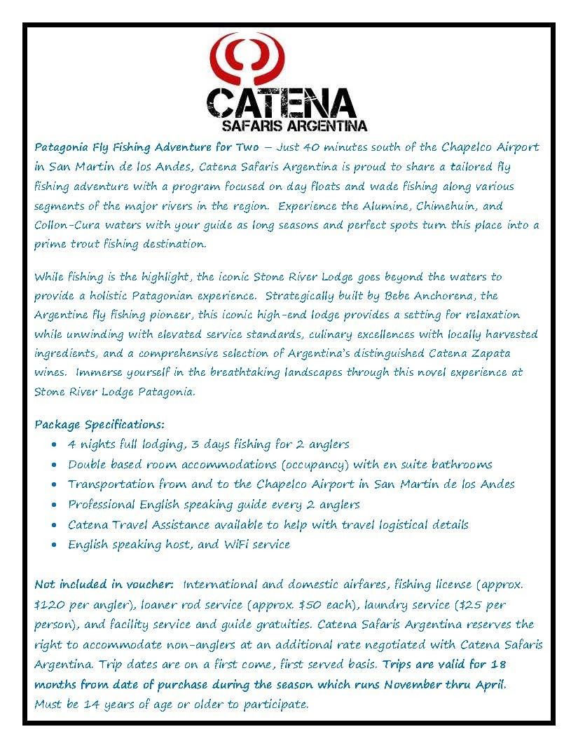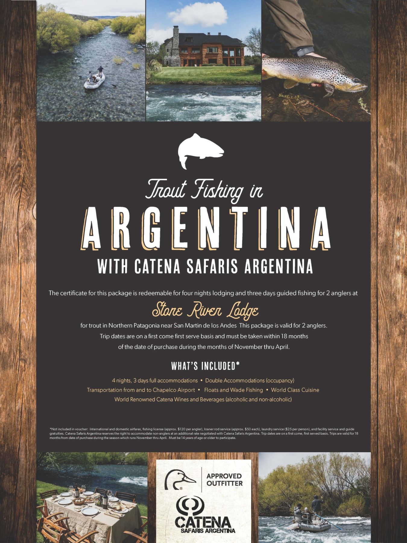 Just 40 minutes south of the Chapelco Airport in San Martin de los Andes, Catena Safaris Argentina is proud to share a tailored fly fishing adventure with a program focused on day floats and wade fishing along various segments of the major rivers in the region. Experience the Alumine, Chimehuin, and Collon-Cura waters with your guide as long seasons and perfect spots turn this place into a prime trout fishing destination. While fishing is the highlight, the iconic Stone River Lodge goes beyond the waters to provide a holistic Patagonian experience. Strategically built by Bebe Anchorena, the Argentine fly fishing pioneer, this iconic high-end lodge provides a setting for relaxation while unwinding with elevated service standards, culinary excellences with locally harvested ingredients, and a comprehensive selection of Argentina’s distinguished Catena Zapata wines. Immerse yourself in the breathtaking landscapes through this novel experience at Stone River Lodge Patagonia. Package Specifications: 4 nights full lodging, 3 days fishing for 2 anglers, Double based room accommodations (occupancy) with en suite bathrooms, Transportation from and to the Chapelco Airport in San Martin de los Andes, Professional English speaking guide every 2 anglers, Catena Travel Assistance available to help with travel logistical details, English speaking host, and WiFi service. Not included in voucher: International and domestic airfares, fishing license (approx.$120 per angler), loaner rod service (approx. $50 each), laundry service ($25 per person), and facility service and guide gratuities. Catena Safaris Argentina reserves the right to accommodate non-anglers at an additional rate negotiated with Catena Safaris Argentina. Trip dates are on a first come, first served basis. Trips are valid for 18 months from date of purchase during the season which runs November thru April. Must be 14 years of age or older to participate.