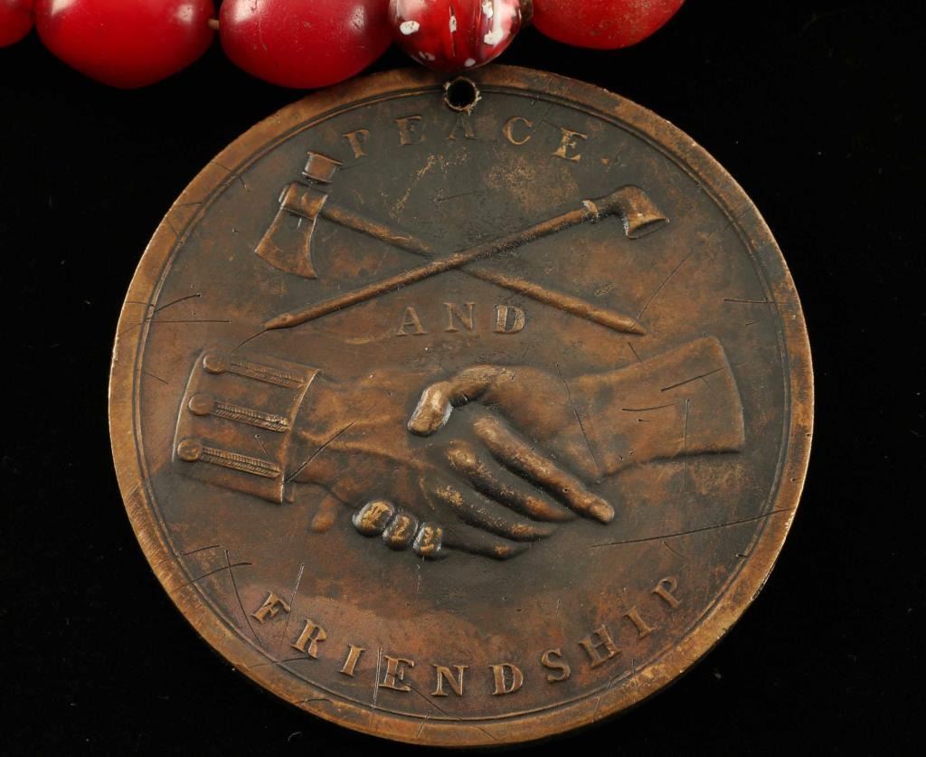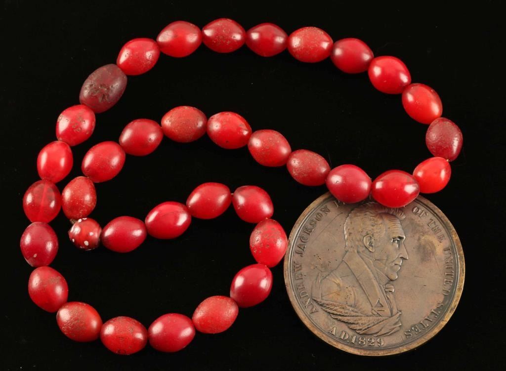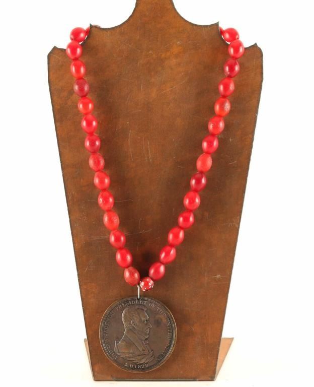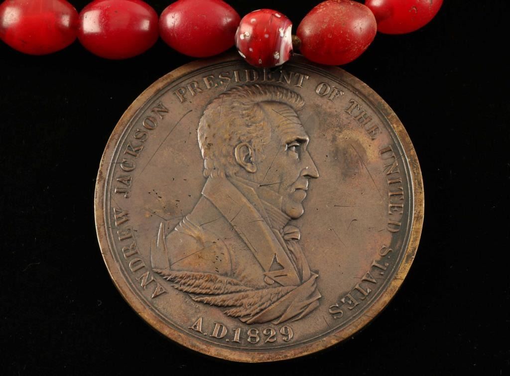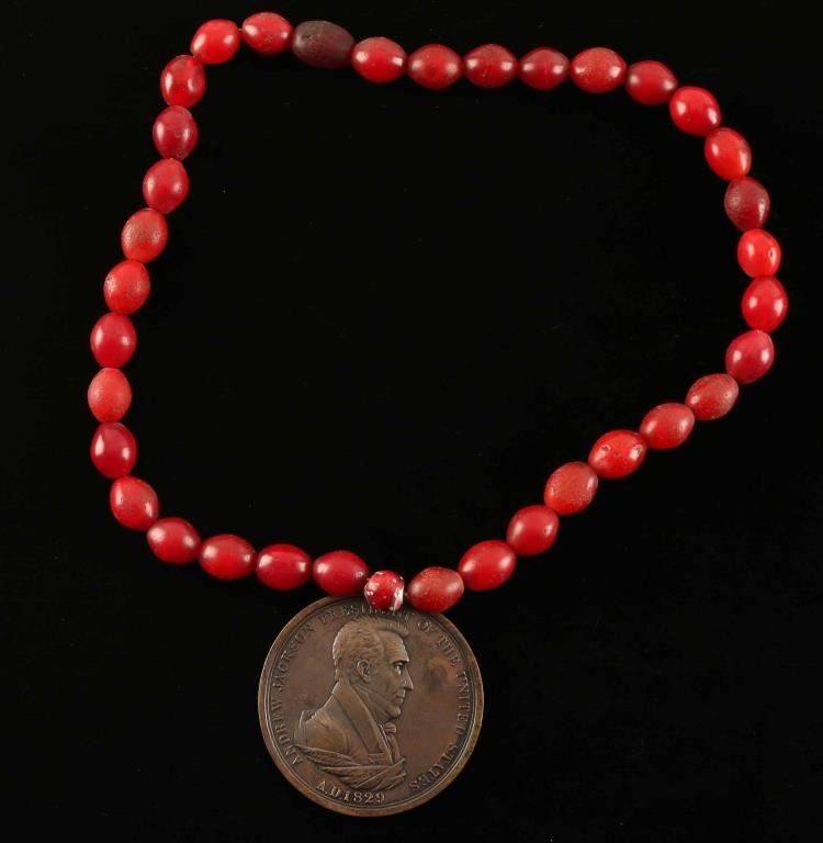 Andrew Jackson medal on red trade bead necklace.