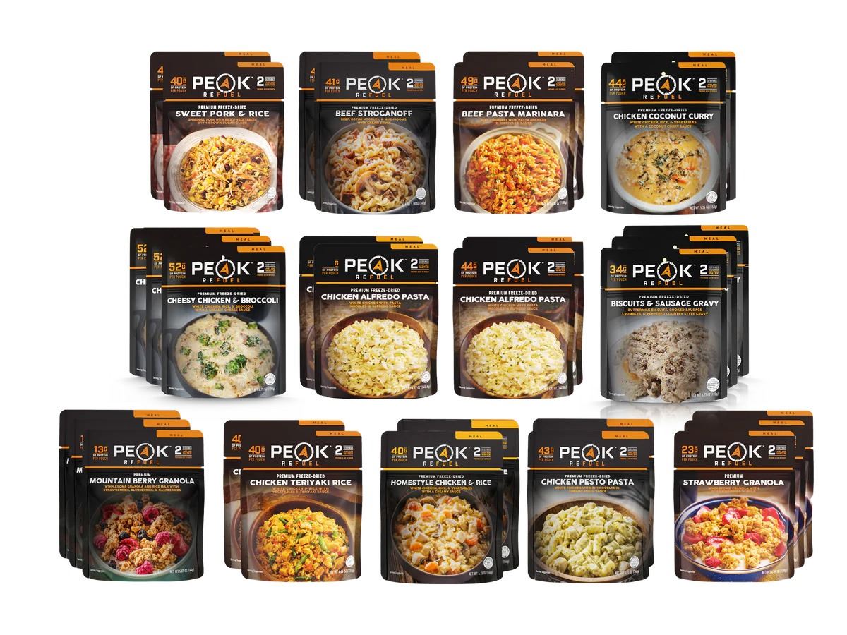 Description: Peak Refuel Wasatch Food Package. Peak Refuel builds high quality, freeze-dried food for the backcountry. This specific product bucket contains 30 of their meals equaling 10,180 calories inside. Peak Refuel's meals are formulated to deliver the amazing taste you would expect on any adventure. They've created the best freeze-dried meals on the market – always using 100% real meat and premium ingredients to ensure you’re at your highest level wherever your compass takes you. HIGH PROTEIN | 100% REAL MEAT | PREMIUM INGREDIENTS - Wasatch Pack (3- Creamy Chicken Broccoli, 3 - Biscuits & Sausage Gravy, 2 - Homestyle Chicken & Rice, 2 - Beef Stroganoff, 4 - Chicken Alfredo, 2 - Chicken Coconut Curry, 2 - Beef Pasta Marinara , 2 - Chicken Pesto Pasta, 2 - Sweet Pork and Rice, 2 - Chicken Teriyaki, 3 - Strawberry Granola, 3 - Mt Berry Granola) {30 Total}