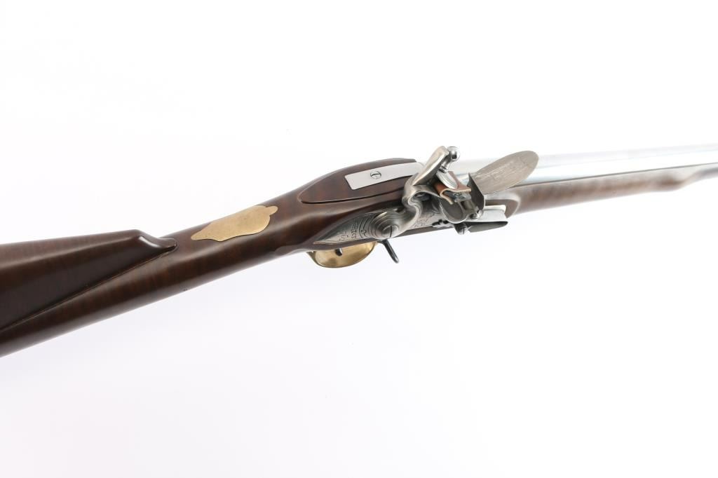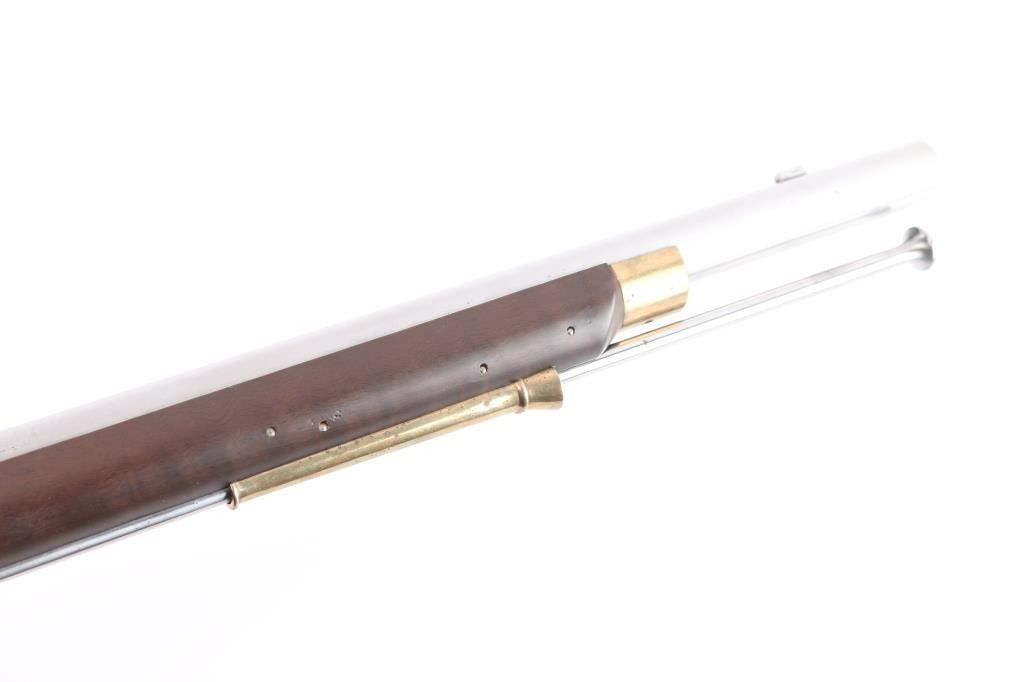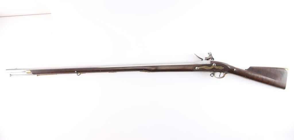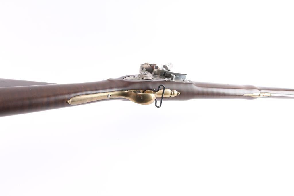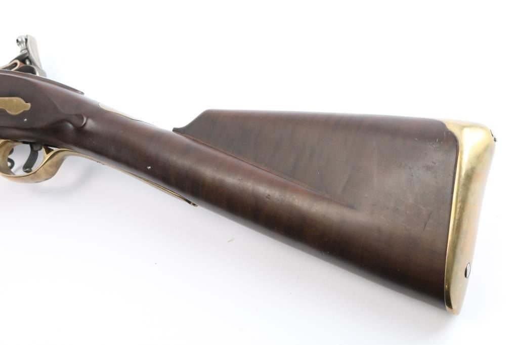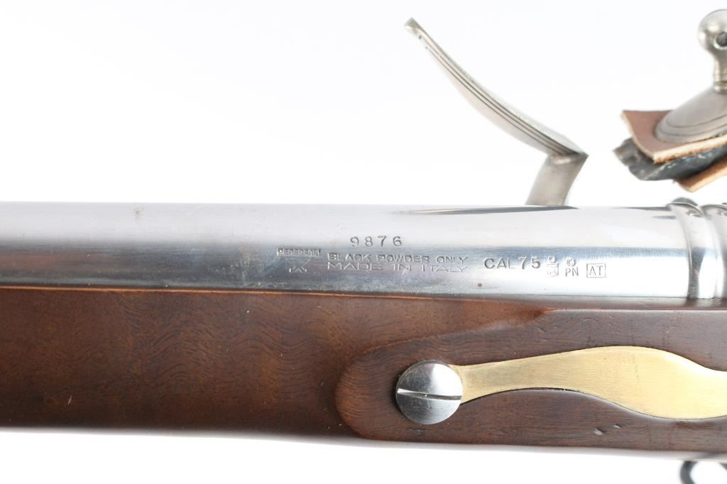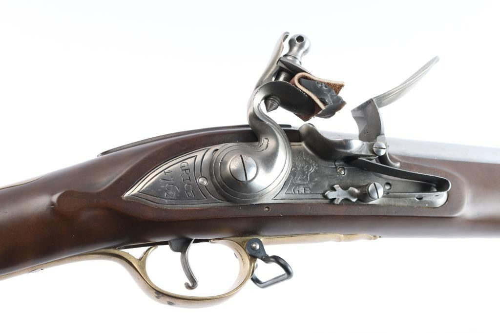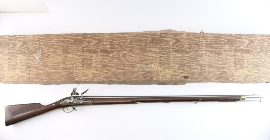 Italian made copy of the British 'Brown Bess' Flint-lock Musket. The standard Infantry rifle of British forces during the American Revolution. Features stainless steel finish, 42" tapered, smooth bore barrel. Front steel stud sight, which doubles as a bayonet lug. Brass hardware, oil-stained walnut stock. Steel barrel ramrod, and lock. Lock plate marked "Grice 1762" with Crown over "GP". Overall Brass escutcheon on left stock. Brass plate behind tang, brass butt plate, sling swivels, Italian proofs on barrels. 58" overall. Bore is very good, slightly dirty. Two cock hammer locks up tight. Retains approx. 95% finish with some light rust spots on brass parts, especially by the ramrod, small scratches and handling marks. Wood is very good with a few small dents and scuffs on the stock. Comes with original factory box. NRA Condition is Good++. ***Antique firearm***.