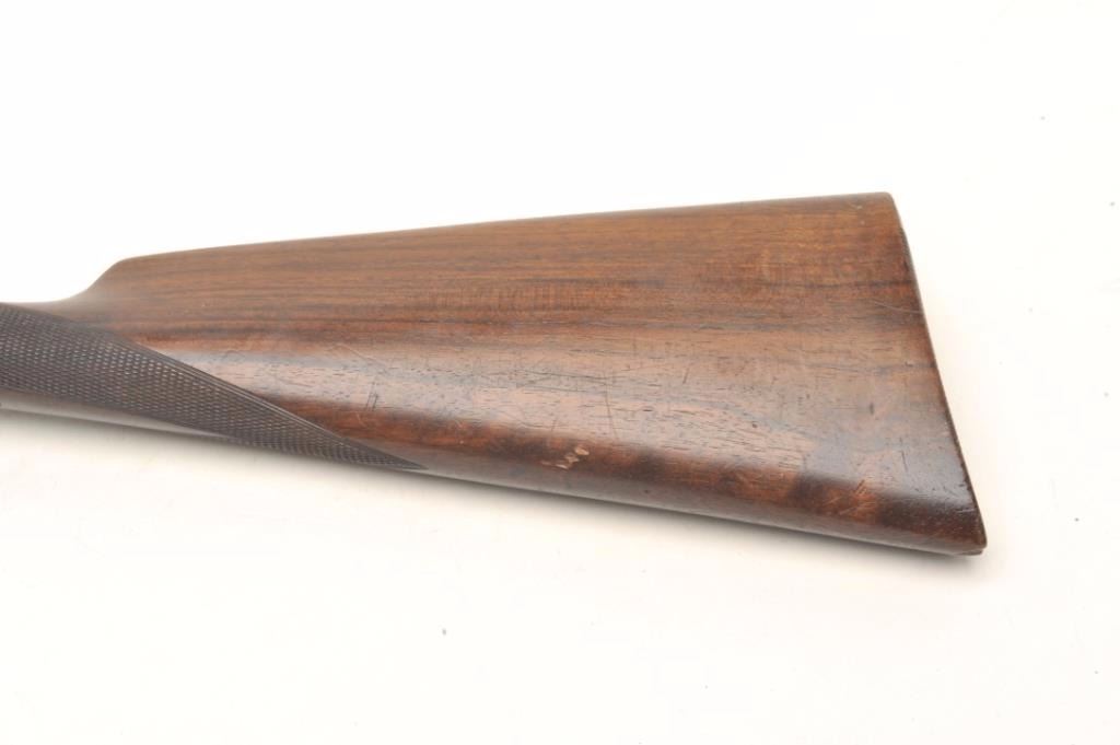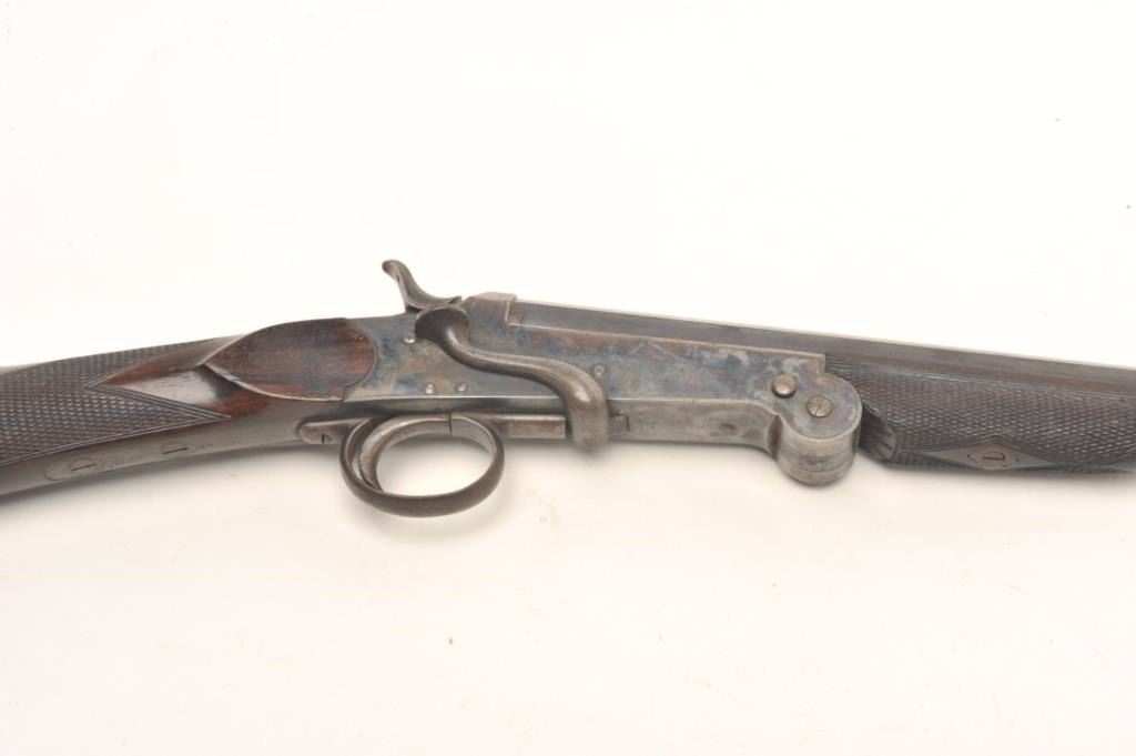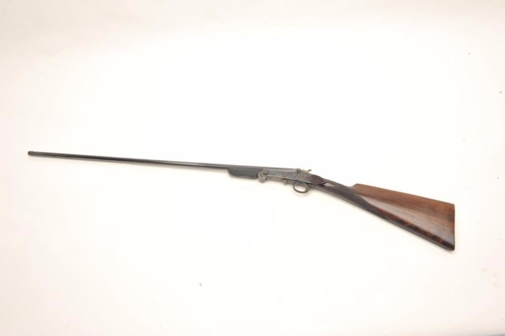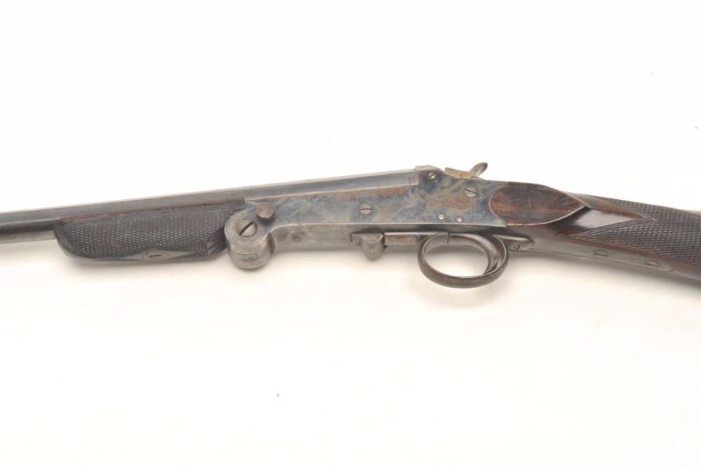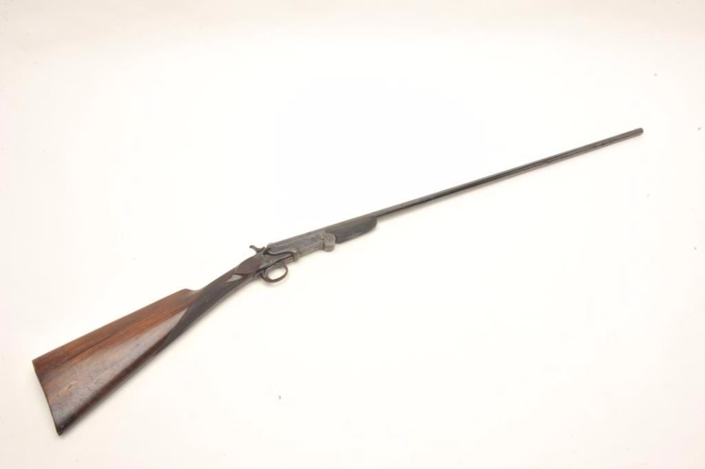 Peiper patent .410 single barrel exposed hammer antique shotgun with a 29 ¾” barrel and measures 45” overall. About 95%-98% blue and case hardening remaining. Near excellent wood with minor marks. 14 ¼” pull andprobably 2 ½” chamber with bright bore. Belgium proofs. (Antique) Est.: $350-$700