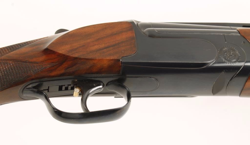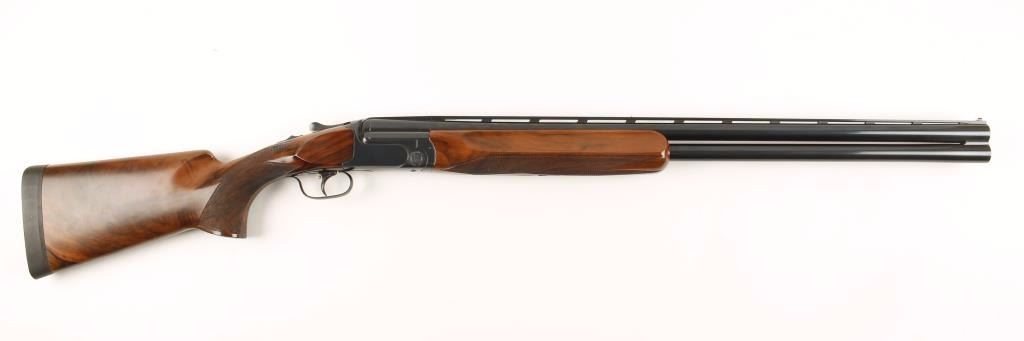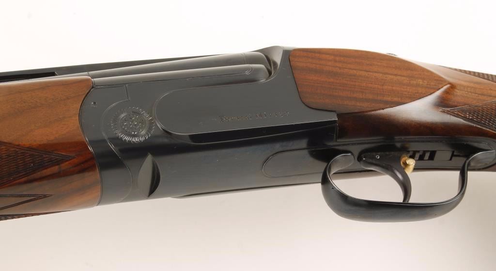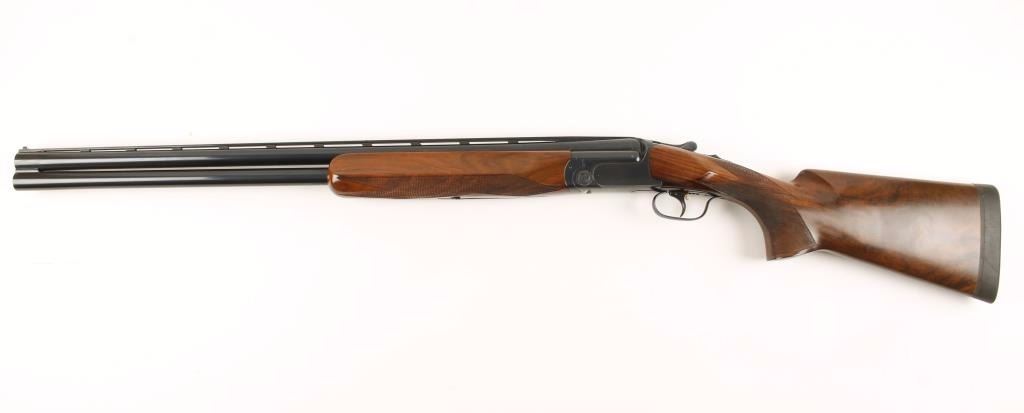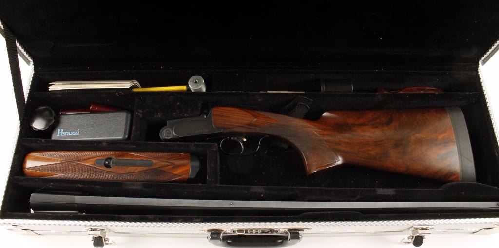 Highest quality Italian made under & over shotgun set chambered for 2 3/4" 12 Gauge shells, imported by Perazzi USA. Features a fully blued finish, light floral engraving, 27 3/4" barrels marked Cam .70, KG1.480 & 18.4, removable chokes, raised serrated ventilation rib, ivory beaded front sight, brass bead mid sight, removable select trigger, checkered top lever, safety switch and beautifully checkered premium grade wooden forearm & pistol grip shoulder stock with Kick Eez rubber recoil pad. Includes a full set of Kolar Arms 410, 28 & 20 Gauge 27 11/16" tubes, two sets of Perazzi chokers with tool, manual, additional tools, and snap caps all enclosed in an aluminum "All American Case" by Nasco Aluminum Co.. Finish on shotgun is nearly flawless with the only observed wear being from the forearm rubbing on the barrels. Action is crisp, Bore is bright and wood stocks are impeccable. A marvelous set. Condition is near mint. ***Modern Firearm***