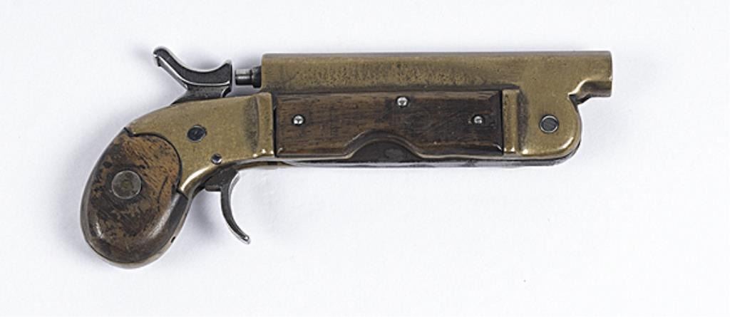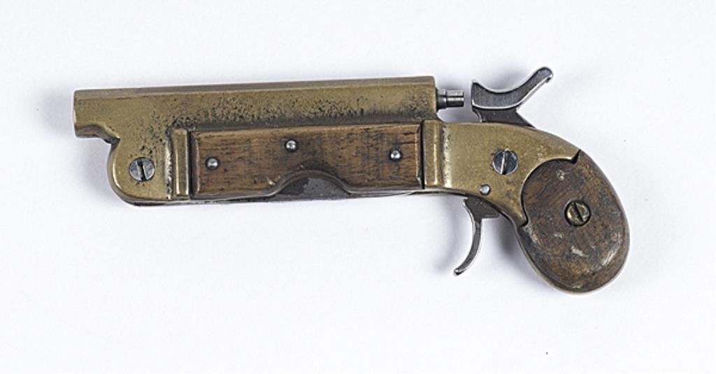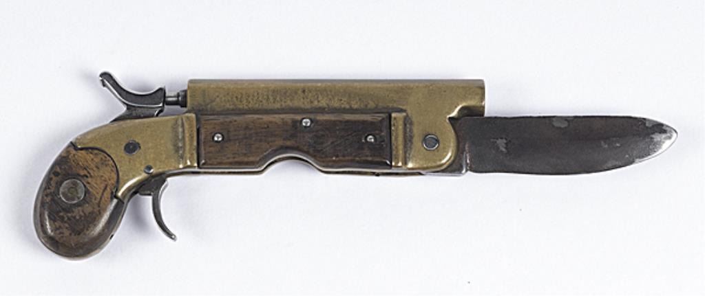 Percussion Pistol With Folding Knife, .31 caliber, 3.5" brass barrel with 3" folding knife blade, walnut grips. Smooth bore. Brass has a warm mellow patina with scattered pitting, grips and knife scales show dents and dings from carry ware.Est:$300-500