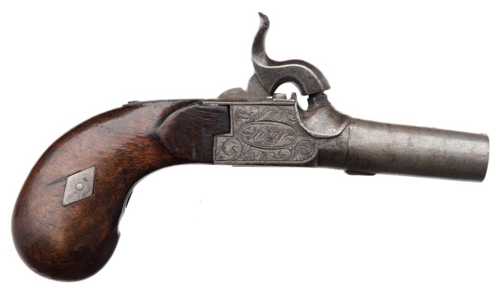 Percussion muff or belt pistol, .45 caliber, wood grips with N.Y. maker’s name inscribed on left side of frame; possibly “G.C. Shoder”; good action and grips; dark patina to metal surfaces. Est.: $400-$800.