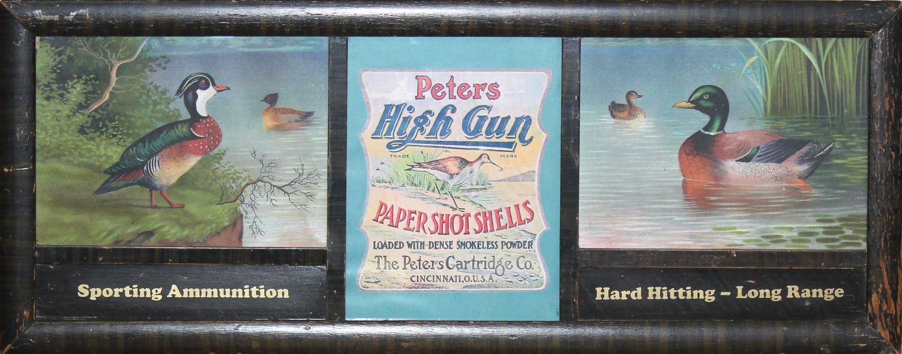 Appealing vintage advertisement for Peters Shot Shells, featuring brightly colored duck images and great original marked frame. Measuring 24"x 9 1/2".