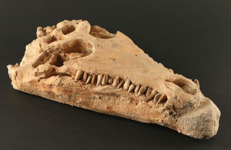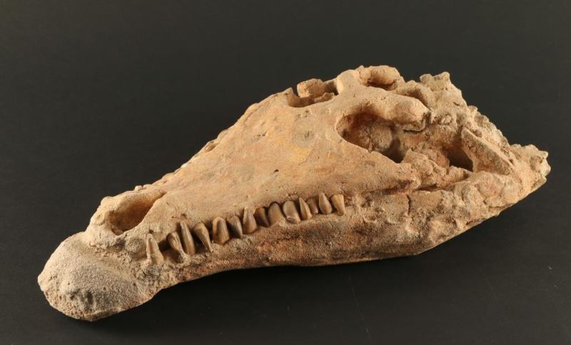 Perfectly petrified in the sand, complete with crocodile smile. Measures approx 13 1/4'"l x 4"h x 7"w. Great display piece.