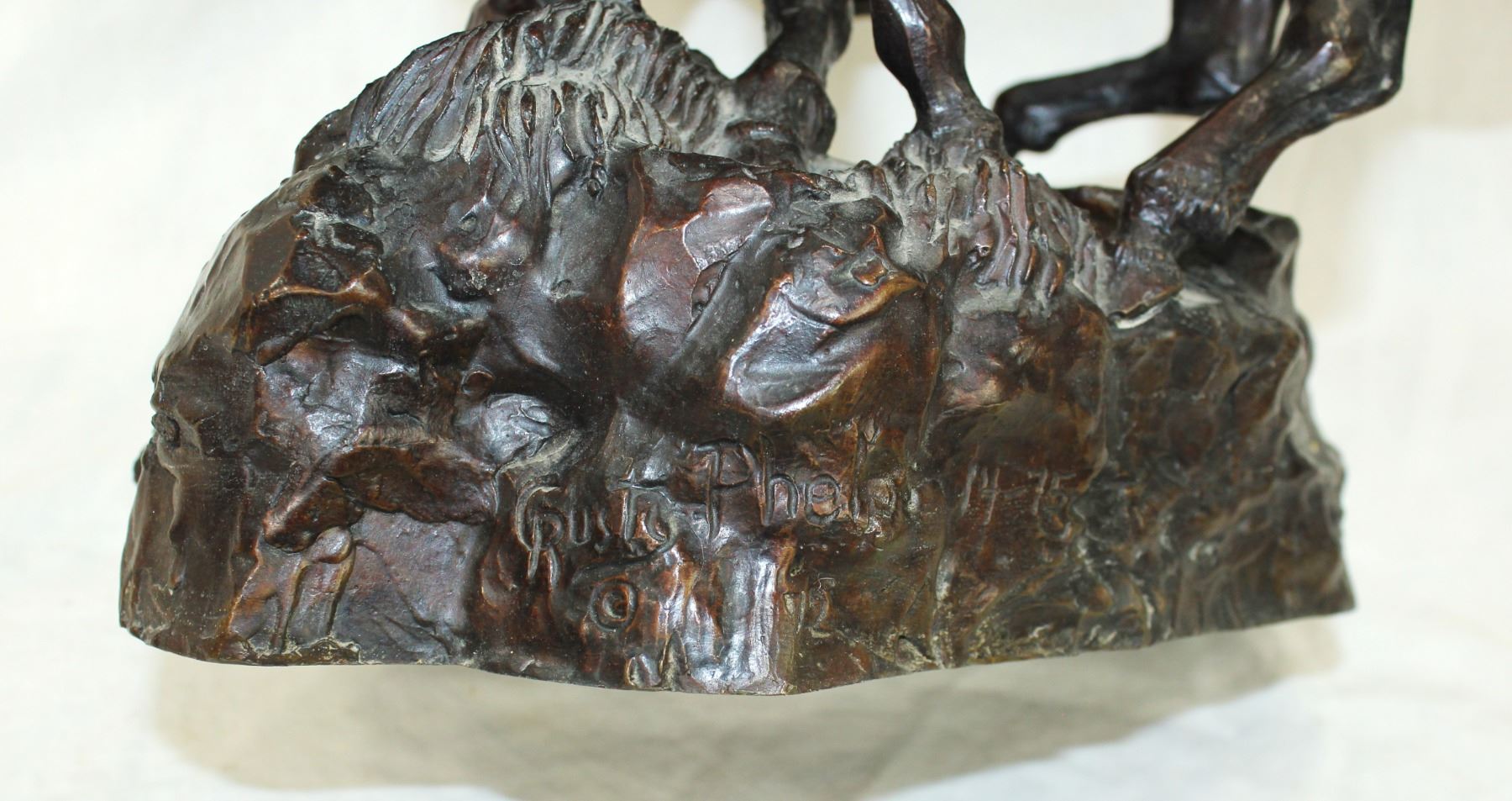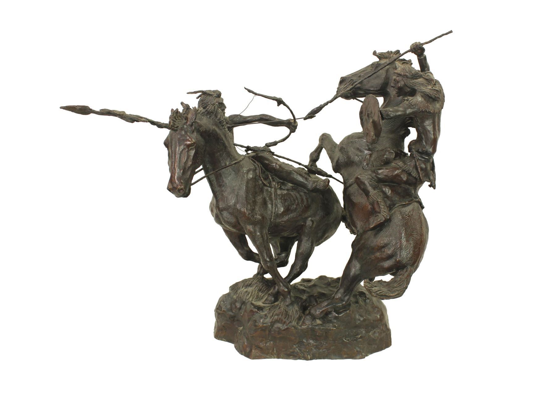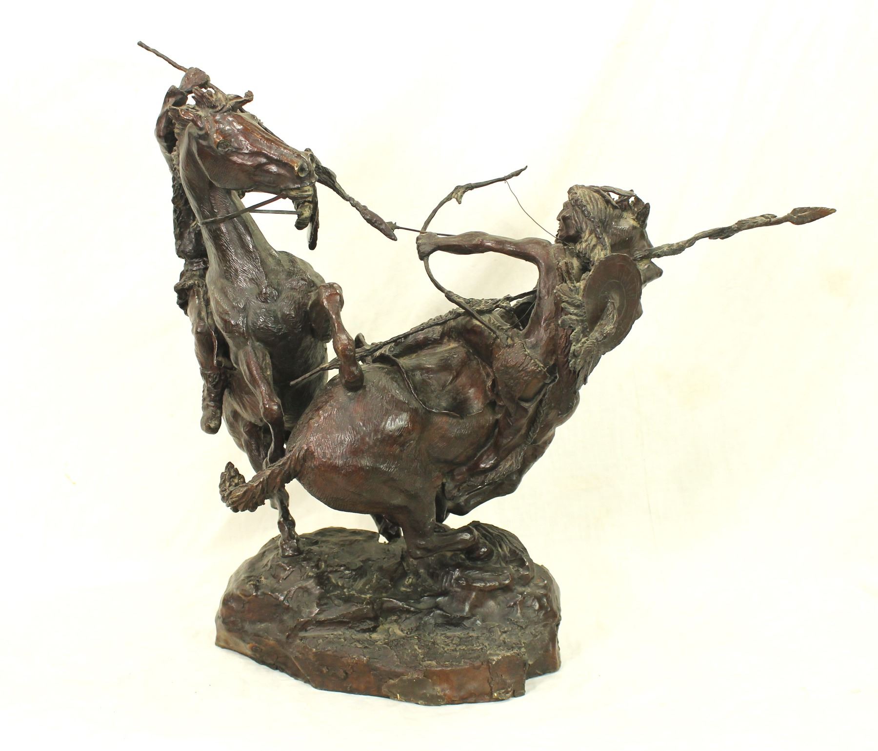 Wonderful large bronze depicting action packed Native American battle scene. Nicely signed on rear, and measuring 20"x 22".